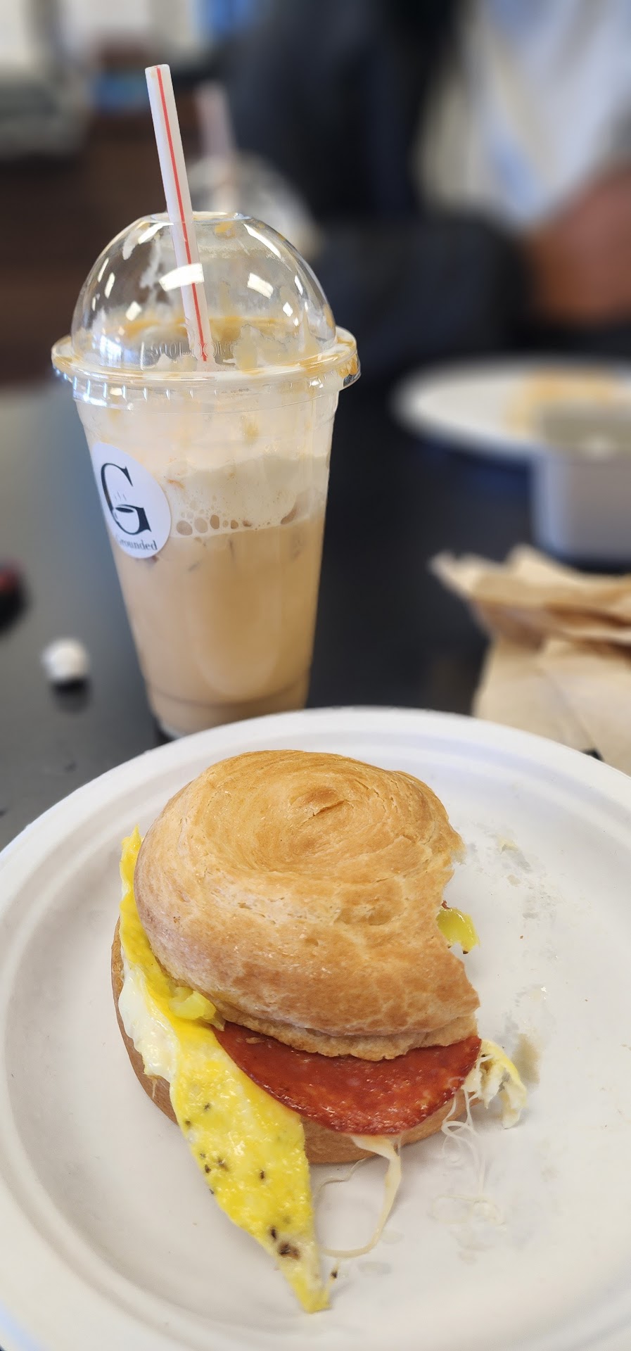 I went out to take care of somethings and found out about Grounded after meeting the owner! So my Husband and I went over (I love coffee) and let me just say the experience, the vibe, the coffee and the food were amazing. It gives me a vibe from back home. We walked in and were greeted by every single person there. Including Poppy who is the nicest and sweetest! We call my grandfather Poppy and we talked about how it's common where we are from. My Husband had the Golden Kiss of Death and WHEW!! It will definitely wake you up! I had The Sweet Carolina and it was sooo good. We had the Fireman sandwich for breakfast the croissant roll was light fluffy and sweet, eggs were perfect with banana peppers, pepperoni and pepper jack cheese. Poppy and I were explaining (or trying to explain!) what pork roll is to my Husband (he's from here) and Poppy went and fried him a slice and now he's hooked 🤣 Pretty sure I just found a...