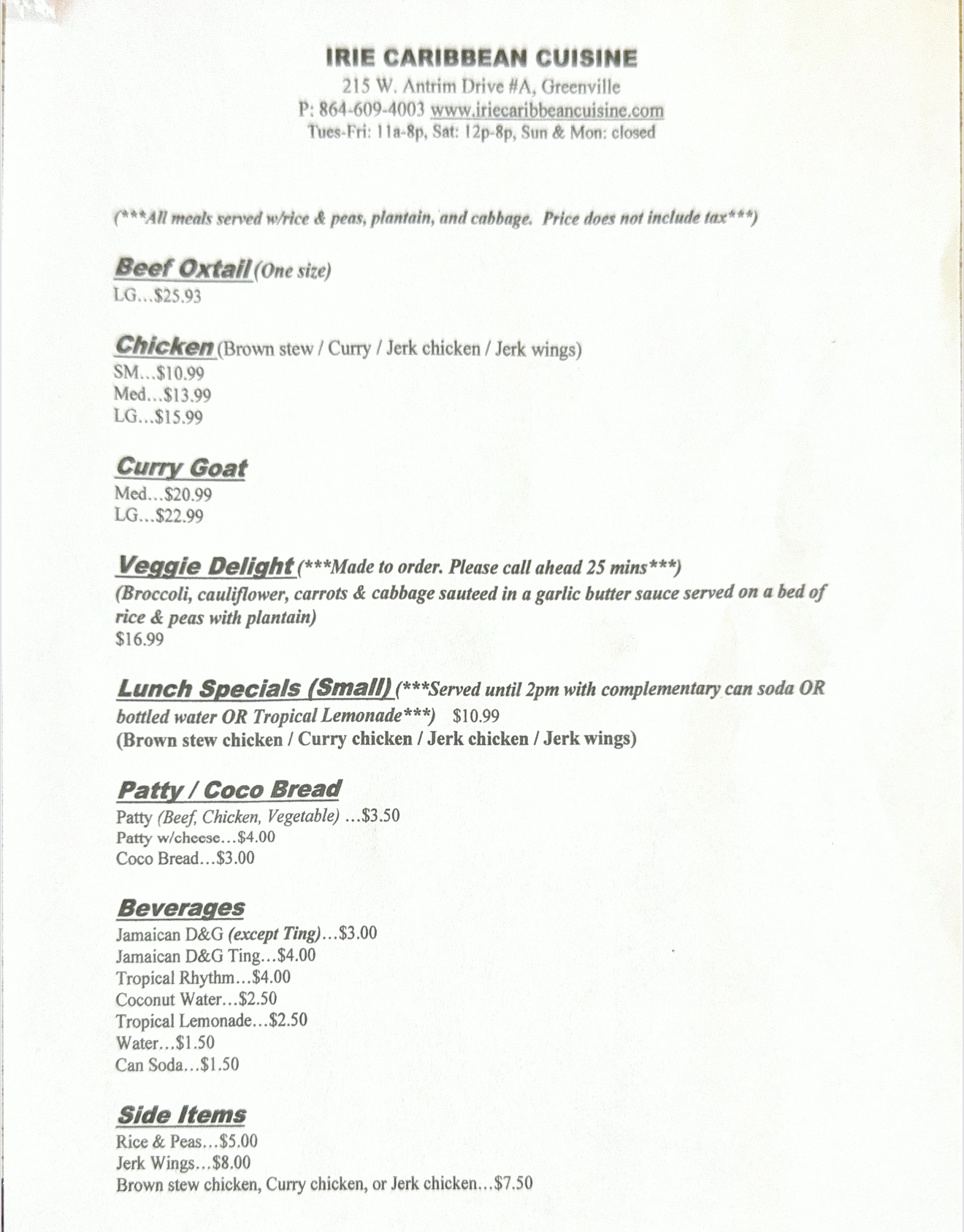 Chef/owner Lawrence came out to greet us and you can absolutely feel the love of a home cooked meal through his dishes but also his personality. It's so RARE to feel that WARMTH from food or a restaurant but he was absolutely RADIATING it. Even the other gentleman behind the counter checked on us frequently to make sure we needed anything. They all talked to us like we were family and that weāve known each other since forever! We couldn't ask for a better way to end our short visit in Greenville than this! THIS PLACE IS A MUST!!! Next time we are in town, we shall return!! Thank you IRIE!
