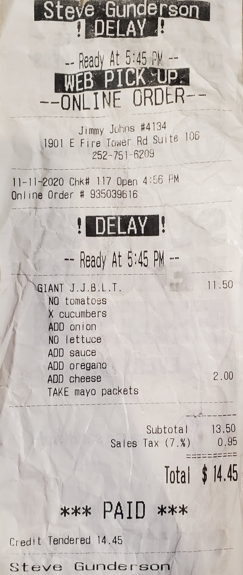 This is the first time I’ve ever had to write a 1-Star review that being honest, I’m disappointed it has to be Jimmy John’s in Greenville, NC. Placed my order on the way home from work 11-11-2020 for pickup at 17:45. Arrived at the store 17:38, parked, and waited for notification of completion. As luck would have it, where I was parked gave me a clear line of site into food preparation side of the restaurant and I noticed an employee wiping his nose with a brown napkin, which wasn’t any cause for alarm…..yet. He finished wiping his nose and then walked right over to the meat slicer and began wiping the machine and the counter next to it with the SAME NAPKIN. At this point I began recording this employee “cleaning” the area and if wiping his nose and using the same napkin wasn’t enough, I couldn’t help but to notice that he either didn’t care or wasn’t trained about cross-contamination due to wiping the inside of one machine and then the counter next to it then the inside of another machine. All of this and he very obviously wasn’t wearing a mask or gloves, it just blew my mind. When other costumers came in he was able to “see without being seen” and was able walk a short distance and be completely of view from the restaurant. Then he could continue to work and wouldn’t be seen without his mask….he thought. So I continued recording and after another customer came in suddenly his mask re-appeared along with my notification to pick-up. I went in asked a female employee to speak to the manager (important to note she was in food prep area speaking to male employee and neither employee was wearing a mask). To my horror the same person I just seen do all these disgusting things turns (mask magically in place) turns around and says “How can I help you?” I told him I had just watched him cleaning and saw him wipe his nose and then use the same napkin to clean. And he said, “how could I do that with a mask on?” I said, “Because you weren’t wearing it, or gloves, that’s why I’m telling you how completely unsanitary and disgusting it is especially in our new world with COVID”. He denied my allegation again to which I said, “Dude I was recording you, don’t try to lie”. He then said, “then show me the video”. To which I said, “No way, if you’re in charge and are doing all this the video is going to the owner, then you can watch it together”. Suffice to say things were escalating quickly and I apologized to the other two employees for the situation, thanked them and turned to leave the “manager” had become audibly upset because of the tone of his voice saying a variation of “please leave this establishment and do not return!” Except it his version was a demand that was shorter, and far less cordial which included several four letter expletives. Hearing the belligerent verbal assault I turned around at the door and said, “Excuse me sir? Where you speaking like that to me?” And the other male employee (still no mask) pointed to the door and tells me to “get out”. I attached pictures of my receipt for my order as well as pictures of the employee without his mask cleaning. I have the video recordings that I will share with the owner and NC Department of Health upon request. The saddest part about this whole situation was getting in my car, looking at the sub I now had to throw away and the stark realization that I would never be able to order or visit this Jimmy Johns again. And not because of this one “bad person/situation” but because with this very public review I’ll have a “kick-me” sign on my back and will never be able to trust them again. Hope this opens people’s eyes to the still very real problems with food prep and COVID, if people are out there that don’t even care about themselves how could they possibly care...