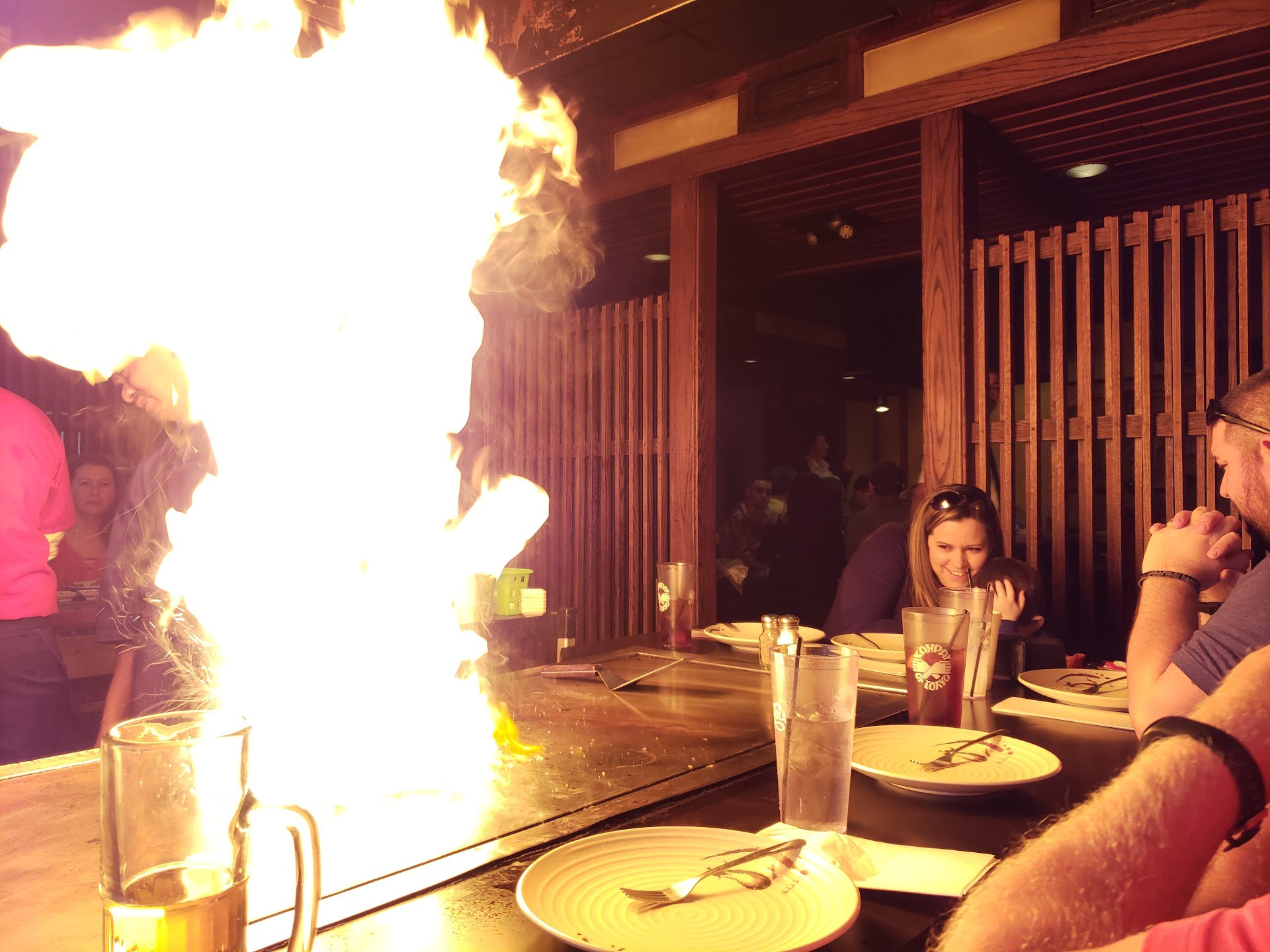 However, when we were seated in the dining area, the thermostat on the wall read 85 degrees. My sister-in-law asked (a manager?) if the A/C was broken, and she replied that it just ate Freon and she was tired of paying for it. The temperature climbed to 95 degrees in the 45 minutes that we waited for our food (we got drinks and salad in a timely fashion and the wait staff was great - so no problem there). It was ridiculously hot and the smoke from the stoves was unpleasant to breathe, but we knew it would be so much longer if we tried to all go to another restaurant. As long as the little kids were doing okay, we could tough it out because we were really hungry. We had invested so much time there already and it would be a huge hassle to try to move our large party to a different restaurant. Eventually, though, my two year old niece was soaked with sweat and after about two hours of good behavior from all the kids (ages 1, 2, 4, and 7) they began to, understandably, melt down. When the kids got upset, we finally decided to pack up and leave. Our chef arrived as were were getting our stuff together, and he understood and was apologetic. I feel bad for everyone working there - I’m sure it was that hot all over the restaurant. We overheard a party from a different room leaving because it was 103 degrees in their room. It can’t be sanitary for it to be that hot - raw meat doesn’t do well around that temperature and bacteria can begin to grow very quickly.