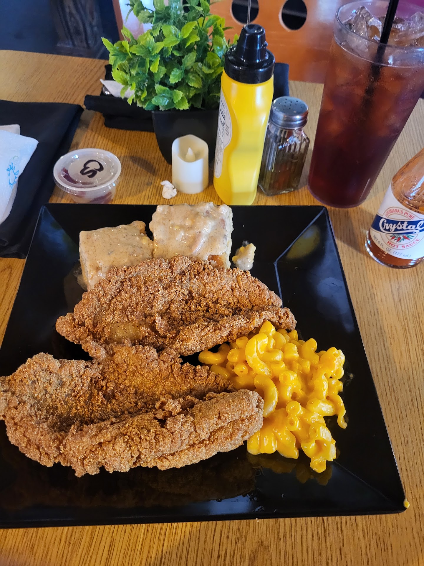 Traveling through Georgia we stopped here for a late lunch based on other good reviews. The place is cute and I liked the soft background music. Sharon, our server, was friendly and asking about where we're from. She also was helpful with answers and suggestion to our question. My husband had the fried chicken with mashed potatoes. He said it was good, and partially liked the dressing. I had the boneless catfish with collards and potato salad. I would definitely order again! The reviews were right -...