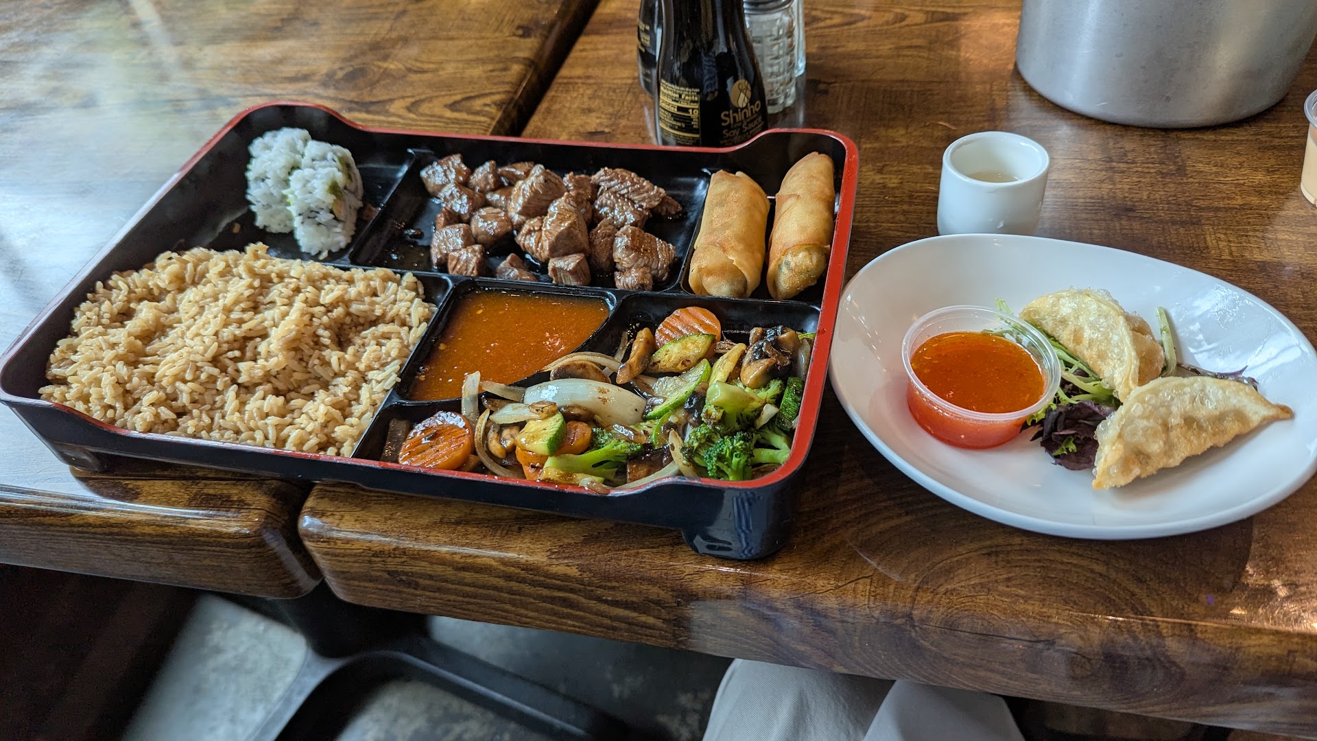 Read moreNice sushi restaurant with great outdoor seating. Just a block or two from main street so you don't have constant traffic right by you if you choose to sit outside. Also, the outside seating is covered nicely! Great waitstaff, very friendly and knowledgeable. They have several specials not listed on the menu, so definitely ask about them! We ended up having one of the specials, actually. The baked mussels. They were very good, with crab salad on top. Our next choice was the lobster tempura roll( if I recall correctly) it wasn't coated and fried. Instead, it had fried crab sticks on top for the crunch! It was delicious! Then was the special ramen soup. Now I like ramen... and this was fantastic! Usually, the pork cutlet in Ramen is not very flavorful... but this one was great! Had a sweetness to it I really liked. Also, the egg had a little sweetness, which I enjoyed. Maby a BBQ type sweetness if I had to describe it. Lastly, the picture of the pepper sauce in the cup, that's good stuff! Not to hot but...