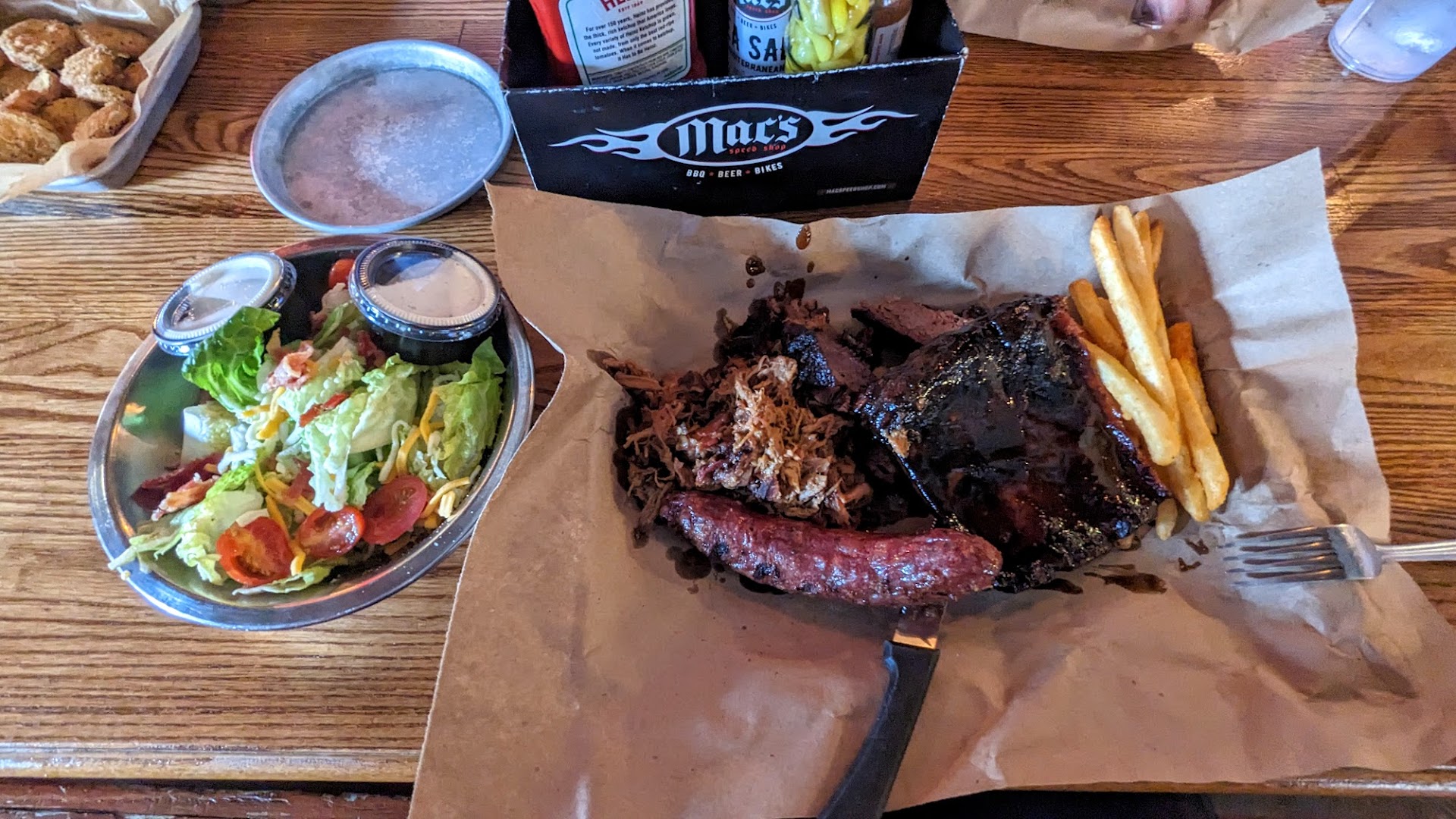 I ordered a 'sampler platter'-like meal to sample as many meats as I could in a single sitting. I got pulled pork, sliced brisket, sausage, and ribs, with a side of fries and a house salad with ranch.