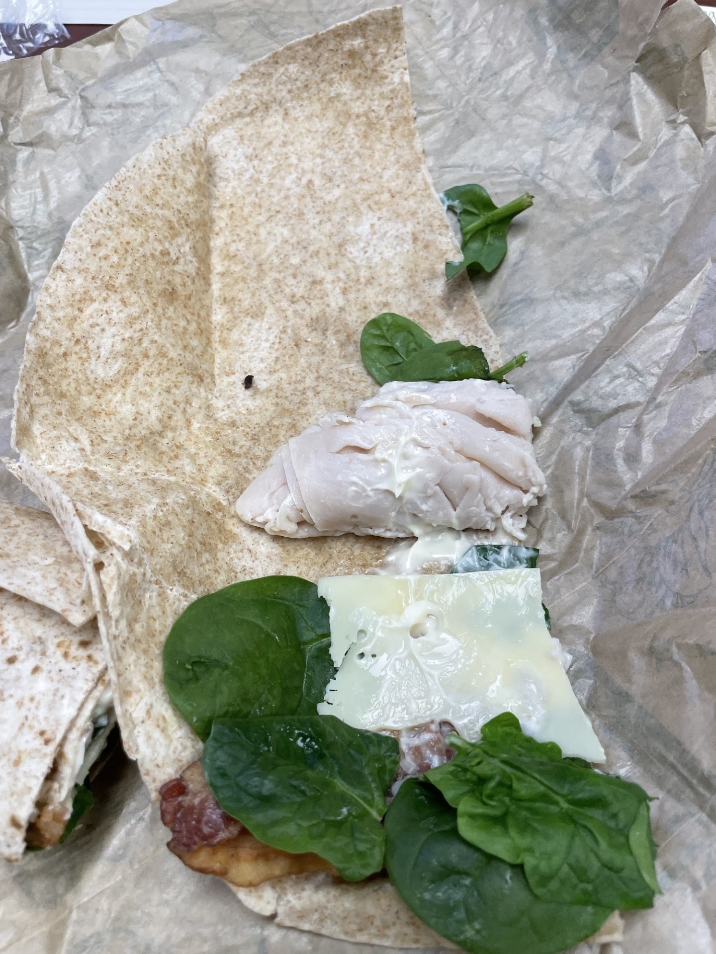 Today was the last day I will be ordering for our office from this restaurant. No matter how much you pay for extra items, or for the original item itself, the result is pitiful. I personally ordered the club wrap today with ham, turkey (and extra turkey), cheese, mayo, add bacon, lettuce, add spinach and got what could be rolled up and compared to a soft shell taco from Taco Bell size item. Far from what I expected. Take a look at my picture. Pitiful. It should have been a filling wrap full of turkey, ham and bacon with cheese, lettuce, spinach. Also, I've ordered the giant spud before and requested extra toppings and it came looking barely topped with anything. Just because we're not in the store we get...