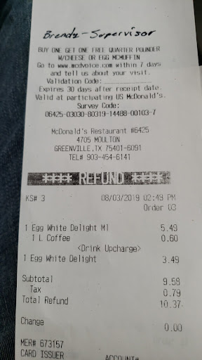 Read moreOk I normally dont come by McDonalds in the evening, I mostly eat their breakfast sandwiches in the morning. I went thru drive thru on 8/2/19 4:18AM and sat in the drive thru for almost 20 minutes and had leave without my order. After work that afternoon 6pm I stop by McDonald's to get my refund only to observe the manager on duty being rude to a customer that didnt receive his order correctly. That customer finally became so frustrated with her comments and fires back at her snatching his food replacement and storming out. At that point I knew that I had it coming to, so I then ask the guy behind the register that I would like a refund and he then goes and relates to this awful of a team manager (Maria). Her response with attitude is that she will not refund my money since the order took place in the early morning. I then ask why not, That I didnt receive what I purchased. Long story short, Managers supposed to be what some employees cannot because for the most part they have the experience to handle most problem issues. I received a refund today after having to explain everything once again with 2 additional trips to McDonalds.