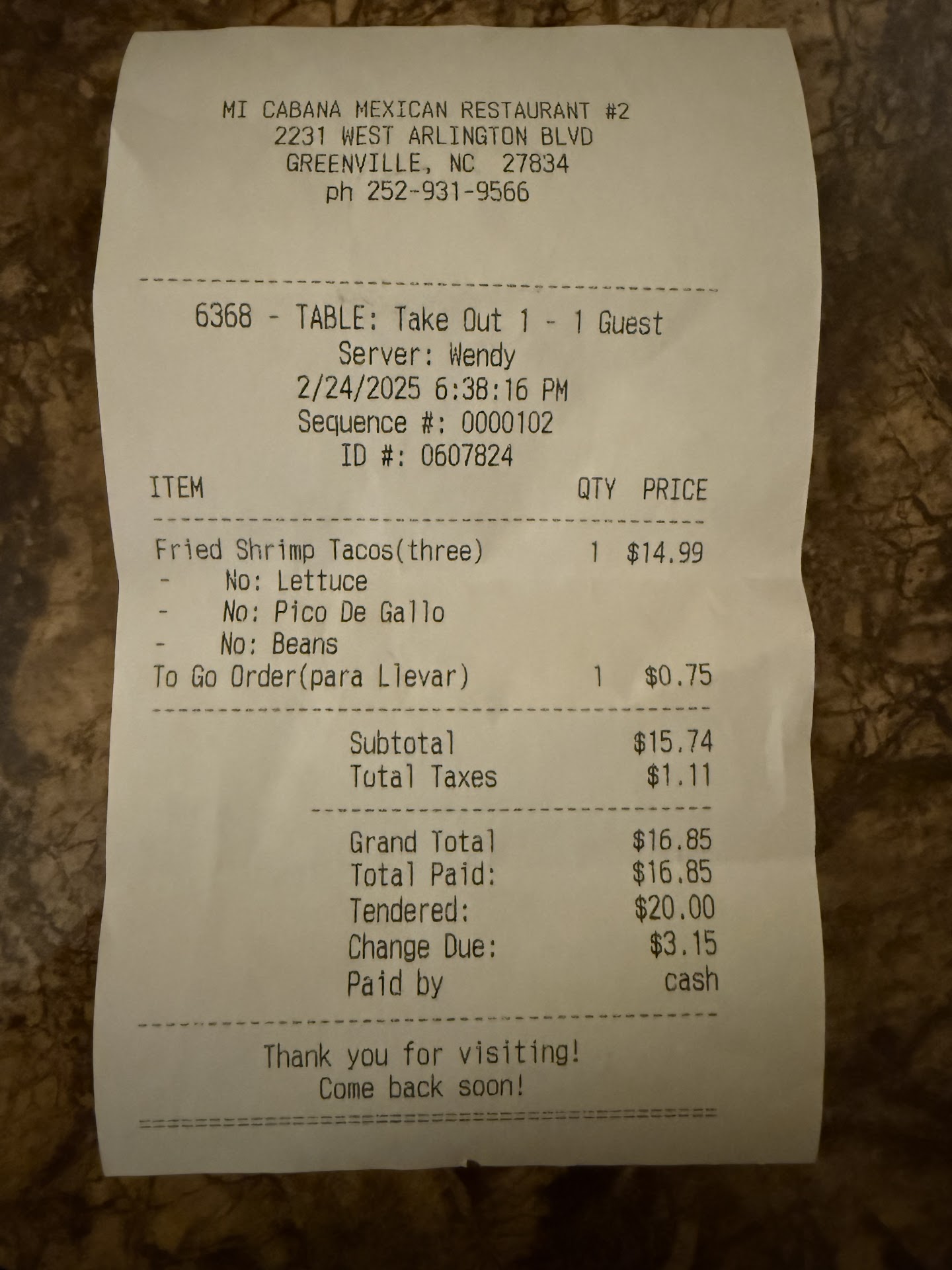 The flaws (the star & a half off) were errors in the take out order & pricing. We ordered cheese dip which was supposed to be free for first time customers that sign up for emails but it wasn't included with our food (and we were charged for it). We ordered both tacos al pastor and tacos de carnitas but instead of the latter, they wrote down & gave us carne asada (steak). The steak ones were good, but we really wanted to try the pulled pork variety.