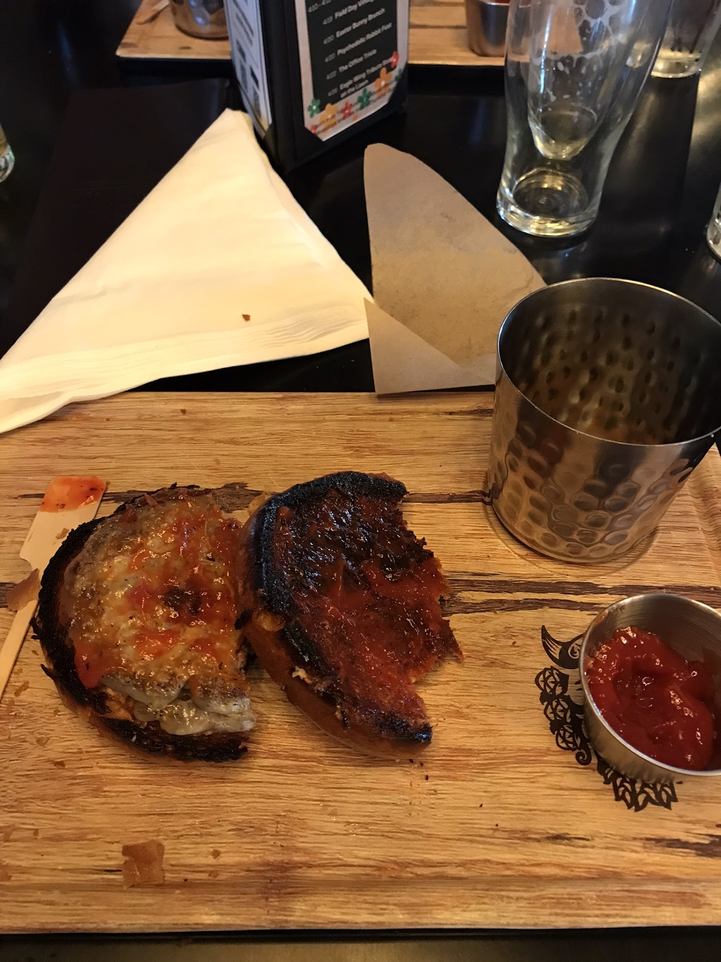 Then, the food... we ordered a pretzel with beer cheese to start. The pretzel was huge (but a little dry) and they give you two tiny cups, one with approx 2 Tbsp. beer cheese and the other with about the same amount of spicy mustard. The mustard was far better than the beer cheese, and I would say just don't order it. For our meal I asked our bartender for his best recommendation of three options, so we opted to split the hot chicken sandwich. It wasn't terrible, but I wouldn't order it again. Understand that the ketchup you get with the fries is again limited to the tiny cup with about 1-2 Tbsp.