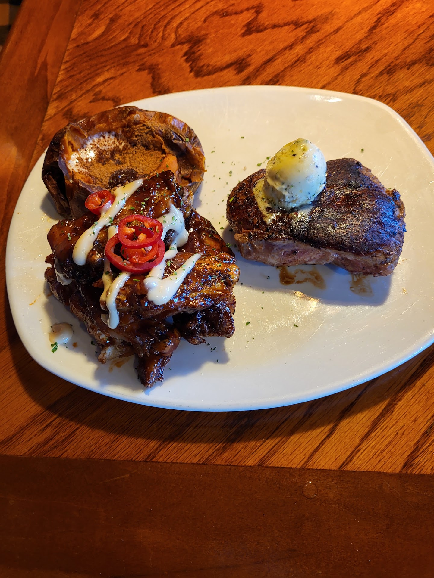 We haven't been to Outback in years!! But we enjoyed our lunch there today, they had several menu options to accommodate our cravings. We were greeted promptly and politely by the manager Alisa, and we were immediately seated with no waiting. I came looking for some delicious Prime Rib, and I found it! I ordered the Prime Rib with fresh steamed vegetables and loaded mashed potatoes, and my lunch date ordered the Chook Ribs and Sirloin plate with Baked Sweet Potato loaded and a House Salad. Both of our meals were very good, there was a short wait, but of course they give you that delicious bread and butter to pass the time! Our portions were plentiful on our plates, the food was prepared correctly as we ordered. I found my steamed vegetables to be a bit under steamed, far too raw and crunchy for my personal liking, but they most definitely were fresh, so no points taken away there, some people prefer them like that, just not my personal preference. The reason I'm not giving 5 stars is because my Prime Rib came with no AuJus, (as indicated on the menu) and I had to ask 4 times (to 4 different people) to actually get it for my meal. I asked the server who delivered my meal, the hostess, the manager and my server. My server did tell me she rang it into our ticket for our meal, however; I suppose the kitchen lost the request in translation. When I did receive it, my Prime Rib had gotten much colder than I'd prefer, but I will say the AuJus was quite flavorful and delicious, I just wish I could have enjoyed it with a hot or warm steak. The bathrooms were clean and well stocked and the restaurant and waiting area were also clean. Overall, we'd return, the food was delicious and everyone has off days, you just...