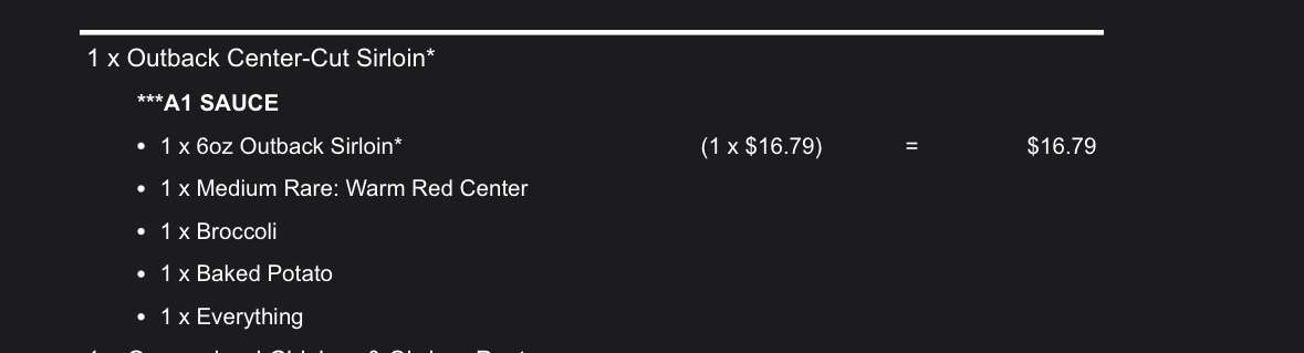 I’ve ordered from the Outback on Orchard Park in Greenville maybe 20 times. I know I’m gonna get awful service. I know there’s a 50/50 chance of my food being correct. I’ve also worked in the food service industry for over 15 years, so take my “critiques” however you may.