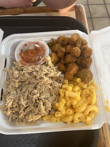 Read moreThis location is a few minutes away from where we live, so my partner and I came here for dinner. I read that the fried chicken was good, so I planned on getting the fried chicken dinner. My partner got the BBQ dinner. We were asked if we wanted a small or a large, and we both went with large. For my dinner, I got the dark meat chicken with three sides: green beans, macaroni and cheese, and french fries. It also came with a choice of hush puppies or corn sticks, and I got the hush puppies. My partner got the brunswick stew, macaroni and cheese, fried okra, and the corn sticks. We got a large sweet tea and a cup of water for our drinks. We placed our order, and the cashier assisted us in navigating the menu and choices. We sat down and waited for about 10 minutes before our order was called. Our meals were about $14 each, and that was an amazing price for the amount of food we got. It could easily be two meals, possibly three. The fried chicken was delicious. Very juicy and flavorful. The mac and cheese was creamy and had a good flavor profile. The green beans tasted very nice and were very green. The french fries were good, too! I tried my partner's fried okra and it was great. Sometimes, fried okra can be slimy, but it was not slimy at all. The hushpuppies and corn sticks felt and tasted like they were freshly fried. The sweet tea was absolutely delicious and one of the best sweet teas I've had in the state of North Carolina. I am a sweet tea fan and I like it very sweet, so this one was great. We got a tea refill before we left, and the person who helped us was very nice! Every person we interacted with was kind and helpful. I like that they have drive-through, to-go, and dine-in options for eating. We really enjoyed this experience and will...