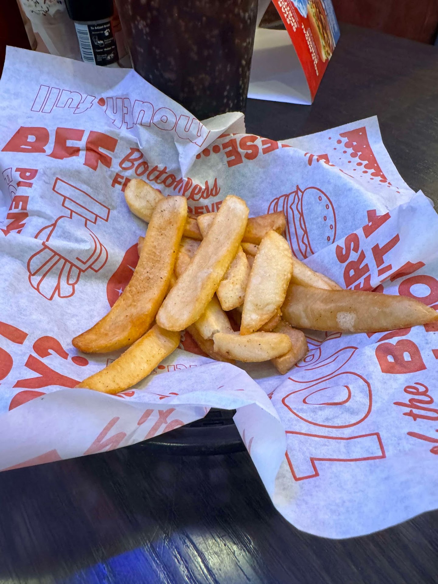 Again, my husband had to go have a chat because they charged us for 3 burgers instead of two. After speaking with the manager, she took off the one but refused to make any compensation for my meal being wrong twice. Or the fact that my husband didn't get the bottomless fries he ordered.