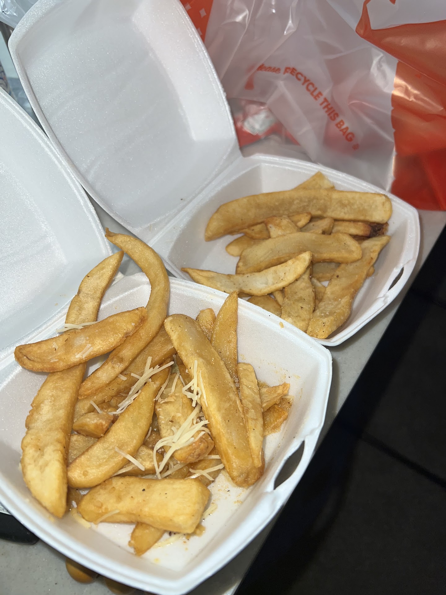 Read moreMe and my wife have ate here at least 30+ times since we moved to greenville in 2020. We’ve never had any issues with food or anything which is why we’ve always continued to come back. Our first time ever getting curbside pickup and the experience was absolutely horrible. We placed our order in the parking lot and it said it would be ready in 20 minutes. That was cool with us. But what really ruined the experience was the bad attitude from the girl coming out bringing food to people. She asked what our name was at 7:05 when she brought 2 other peoples food out which were the only other people getting curbside. She told us she’d go check on it for us. Fast forward 15 minutes its now 7:20 with no update. So we politely call and say “hi I was justing wanting to check on our curbside order” the girl that was bringing food outside was the one that answered and she said “ whats the name? And then says its getting packed right now so i’ll be out in a couple minutes” Okay cool. Fast forward 15 more minutes and she still hasn’t came out. 7:40 rolls around and she comes out but you can tell shes in a bad mood. Just hands us our food and turns around and walks away without saying anything. Well we get on the road and realize we didn’t even get the apple juice that was supposed to come with our kids meal nor did we get any silverware to eat our food with. (Didn’t realize until after we were on the highway) we didn’t turn back around it was whatever. Well then my wife grabs a fry and its stale. They taste like fries that have sat out for hours. EVEN the CHEESE on our garlic fries were stale. Hard as a rock not even slooping down if its hanging off the fries….. The rest of the fries are like this as well. And not only are they dry and stale but all of our food is COLD. How do we wait over 25 mins past when our food is supposed to be ready and receive stale cold food? We live on pelham so our drive is extremely short. Definitely not long enough for cold food. Anyways I’m extremely disappointed and will definitely not be coming back anytime soon. I don’t recommend anyone order curbside here. I posted pics of the fries. Its hard to tell over pics but if you’ve ate the fries here before you know they don’t look right nor...