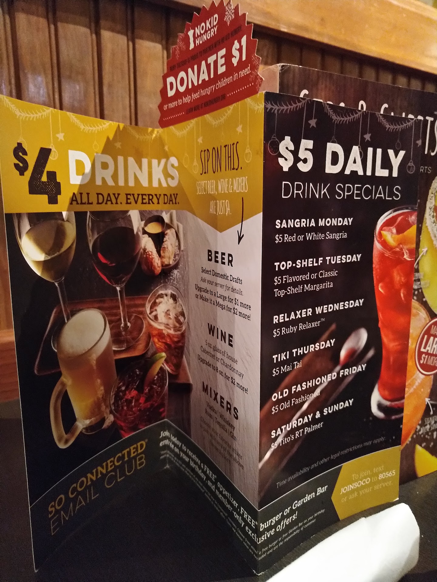 This one star constitutes for how awesome their salad bar is. The other four blanks where stars should be are left blank for failing me for the last time. It was myself , my wife and my three children age 9 (birthday girl), 9 and 1. I order the Burbon Bacon Burger, the shrimp and steak for my wife, fries and chicken tenders and fries and sliders for the big kids. Macaroni and green beans for the kids. They brought the kids food out early. Way earlier than we got our food. They served my kid and adult macaroni with I'm assuming asiago cheese. He started eating it after analyzing for a moment but we had a kids menu and were ordering for kids and we get that. It was fine, they brought a kids mac soon enough. I asked for a water with lemon and received plain water. That's fine. She brought lemons eventually. I ordered a Caesar salad and received fries with my food. I got my salad quite a bit before that but my wife had nothing until she received all of her food. Not sure if the fries were a minor oversight or an attempt to make us happy. Whatever I'll keep going. We asked for refills and the waitress took my kids cup and did not return for some time. The manager brought our refills and the mac. My food was hotter than my wife's. I didn't care about piping hot food but my wife does and she got to eat her no so hot food last. I ate my salad and the extra fries and mac came in handy so the kids didnt have to awkwardly watch us eat. My food was amazing...when I got it but I chose to wait for my wife to eat so we could enjoy our lukewarm meals together. Her steak was good but the shrimp were cold and awful. She had a loaded baked potato. It looked sad. She ate it though so it was probably fine. My daughter had the chicken tenders. She enjoyed them but the portions weren't nearly as good as the kids menu at Kick Back Jacks a week prior. My big son had sliders and no complaints from him. I talked my wife into the big "Top Shelf Margarita" thats usually $10 any other night but is $5 on Tuesday. She asked for a sugar rim. She received a salted rim and was unable to drink it. From what she did taste was no much if any alcohol. At that point we were pretty much burned out. So we're not going here any more unless its for that...