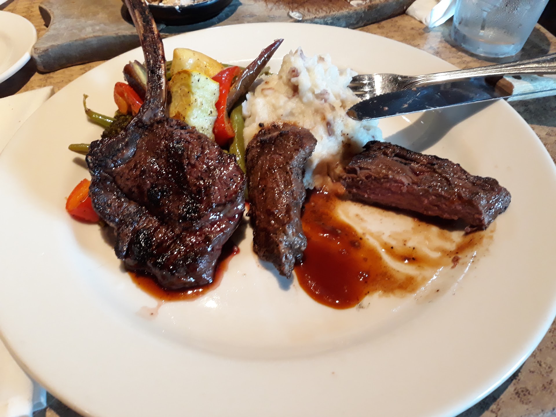In terms of the food, the standout dishes were the Chef's choice mixed grilled main and appetizer and the two buffalo ribeye steaks. The fried alligator bites and bacon wrapped scallops were okay. My first time eating alligator, it was neither here nor there in that it had no detectable flavor - which is maybe a good thing. The scallops, I've had better versions but worth ordering if in the mood.