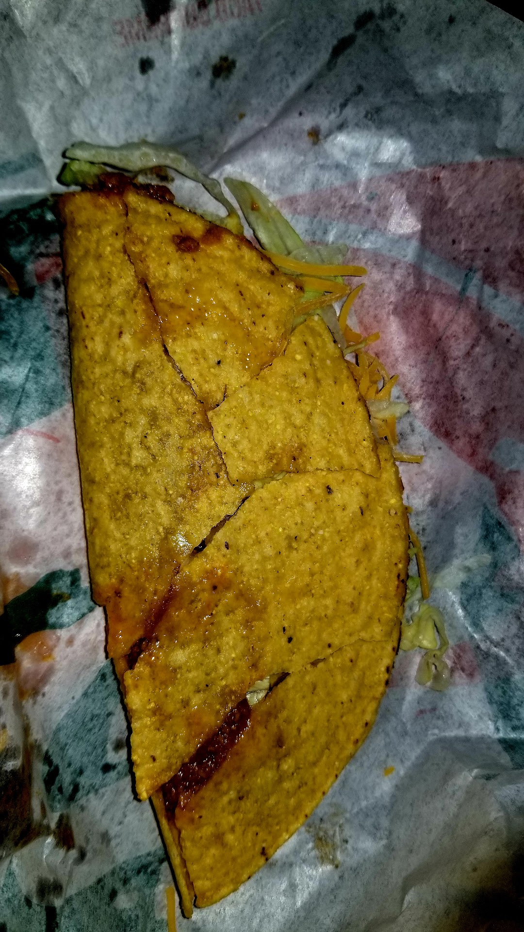 The tacos were crushed (which has happened two other times before at this location). They tasted good but had to be eaten in a bowl. They were placed on the bottom of the bag, under the burritos and the potatoes.
