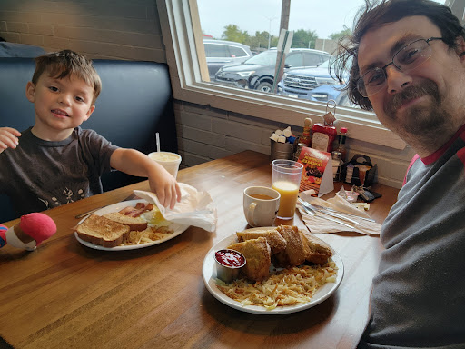 And for my little son, Carson, he got the egg and bacon breakfast platter, and it was just perfect for a four-year-old. The eggs were fluffy, the bacon was crispy – the way bacon should be, not like that soggy stuff they serve elsewhere.