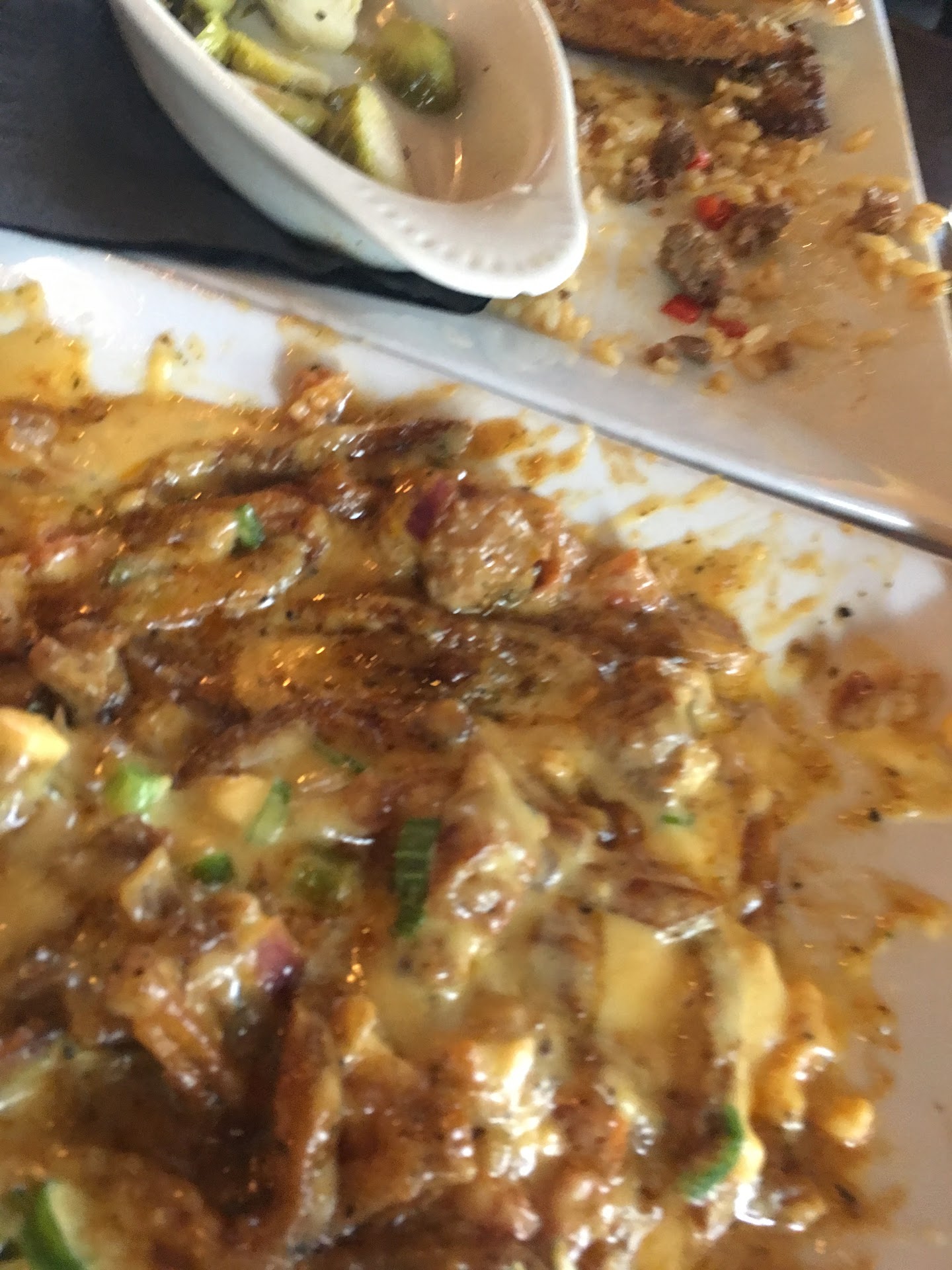 I went for lunch recently. I ordered shrimp and grits and my sister ordered the special which was a red snapper in lemon sauce, i believe. We ordered the poutine fries as an appetizer. They were busy. They only had 2 waitresses covering the lunch shift so everything took a while. The waitress was nice. She did the best she could. We are lovers of cajun food. Our grandfather is from New Orleans. I make it often, at home. I wasn't expecting 5-star quality food at all. I would have given 5 stars if it tasted like chain reataurant quality that was executed well because I'd just be so glad to have the option of eating cajun in Greenville. (Sighhh) Okay. Shrimp n Grits, though, it seems intimidating is one of the easiest and efforlessly delicious recipes a restaurant can make. To be fair, I will say that I had them remove the shrimp because I've developed late-in-life seafood allergies. Their andouille sausage is great. It's flavorful and seasoned well. If they make it themselves, good on them. The grits were a disaster. The texture was a little stiff, but acceptable. However, they tasted like a cardboard box. Literally. Cardboard. They didn't salt them. They melted the cheese on top of the grits rather than cooking it in which is a no-no. The andouille gravy was good. The same gravy as what they put on the poutine fries, but it wasn't enough to save those awful grits. I ordered brussel sprouts. The menu does not say what kind of brussel sprouts they are. I assumed they'd be pan roasted with tasso or bacon and shallot or onion. (TAKE THE HINT, free of charge) but to my palate's dismay, they were pickled. Warm, PICKLED brussel sprouts! How yummy does that sound? 🤦🏽‍♀️ It doesn't complement anything on the menu. It's just rude to put a well-liked vegetable on the menu and not warn us that it's pickled. Nobody does that. Re-think it. The poutine fries were good. VERY rich. Not much cheese curd, (I'm from Wisconsin, so I'm here for the curd) but I do like the andouille gravy, as I said. They served it with the skinniest of seasoned shoestring fries, which were good, but they don't hold up to the sauce at all. It drenches and soggies them very quickly. I left a ton of sunken fries on the plate. Since I had to return the grits, I asked for a small plate of fries so I could finish the appetizer. They happily helped me with that, and removed the shrimp n grits from my order. I hope they'll consider serving the poutine fries with a potato that isn't as easily defeated by the sauce. My sister ordered the snapper with a side of brussel sprouts. Needless to say, she hated the brussel sprouts. But, She was excited about the fish. It was edible, but overcooked. It was dry and crisp in some spots. She says she wasn't getting much of a lemon flavor. We were really disappointed in this We wanted this to be a new spot for us, but their cook needs some help. Cajun food is soul food, but it can be elevated to restaurant quality. Their menu needs a few more non-seafood options. Think Copeland's of New Orleans. I would go back for the fries, gravy...