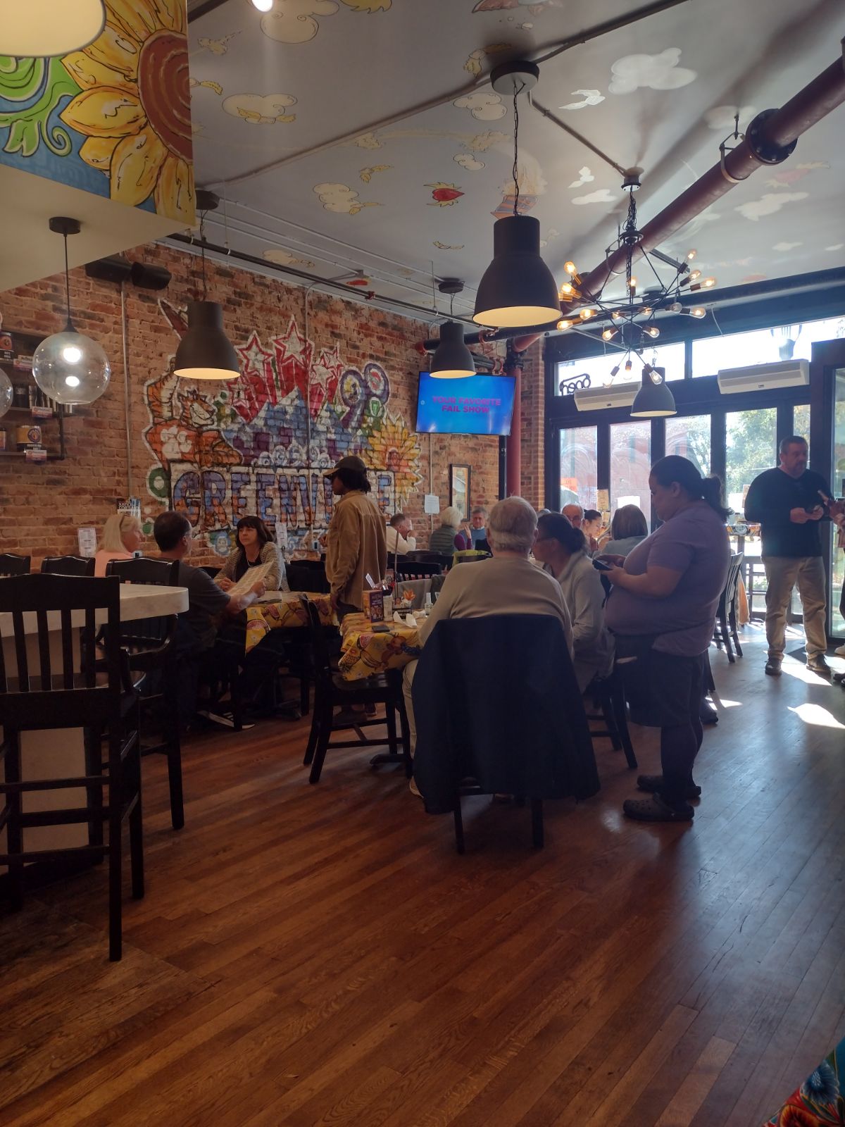 I will say, there were a few kinks in my experience, but I think much of that was just from coming in on a Saturday morning on a holiday weekend. There was a guy blowing up balloon animals for kids and that was a bit busy for me. He stood next to my table for 15 whole minutes blowing up balloons, which we all know is a very loud process. I didn't enjoy that, but hopefully that was just a holiday thing? Not sure. I will say I did not have a reservation but was sat within ten minutes, and they were busy, so clearly they have a good rotation going. I work in food service and I was impressed by how quickly we were sat, and how quickly the food came out. For a holiday weekend that was pleasantly surprising. My bloody mary was delicious. Everything was very fairly priced, I will say even underpriced for downtown Greenville, which will probably keep them busy.