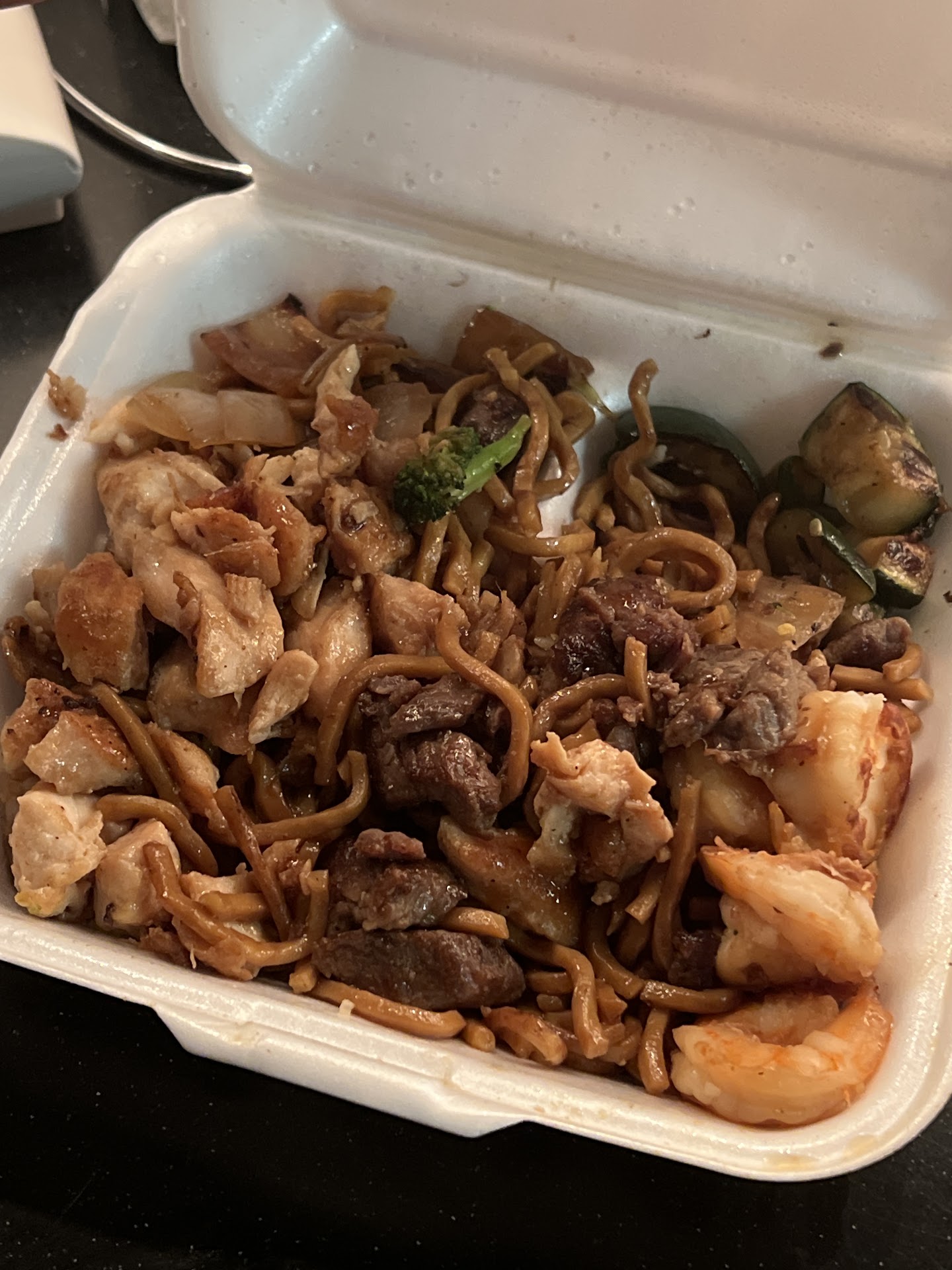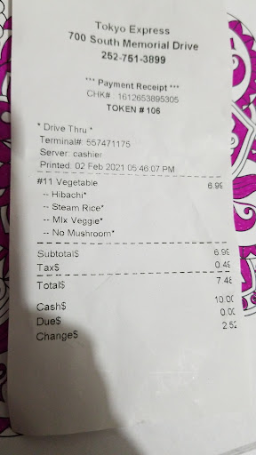 Read moreThis is an amazing idea! This place has a drive thru and you can eat inside. This was my first visit. I went after work so it was around 520pm or so. There were probably 5 cars in front of me but the line moved quicker than expected. I ordered hibachi vegetables but NO MUSHROOMS as I am allergic to them. The lady that took my order was very nice and polite. Yes mam.. no mushrooms. Much to my surprise, the line continued to move quick and I paid for my food and was on my way home. I live about 45 mins away from where I work. The food smelled delicious! Couldn't wait to get home to enjoy it. Much to my surprise, after eating half of the dinner I found a mushroom... I thought... that sneaky mushroom. As I took another bite, I actually BIT into a mushroom. Ok.. so now I look at my food... the last half of my veggies covered up about 1/3 cup of mushrooms. . Again I will tell you that I am allergic to mushrooms. (Break out in hives and itch like crazy) so .. by now I begin to itch.. and then come the hives.. my arms.. back.. head .. hands... it was NOT a fun way to end my day. It's a good thing that they don't make my throat swell. The food was delicious! Just make sure to look at your food closely if you are allergic like I am. Haven't decided whether or not to try again... but I will make sure I check the food before leaving the...