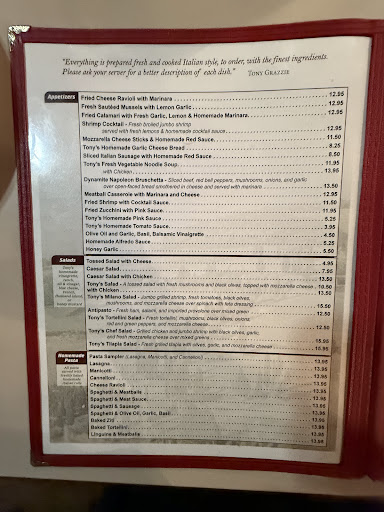 Read moreMy wife and I don’t get date nights very often. We pass by Tony’s every time we go through Greenville. So we decided to give it a try. Being of Sicilian descent, I love finding those hidden gems when it comes to good food. We go in and was instantly greeted by the waitress. We sat down and ordered some drinks as we perused the menu. As we were looking through the menu my wife asked the waitress what her favorites were. She told us, but a good veal Marsala caught my eye. My wife ordered the chicken mimozo(?). We also ordered a salad as a starter. The salad, great. The bread wasn’t bad, nothing special, but not horrible. Our food gets to the table. It was very strange to me. The veal Marsala or Scaloppine al Marsala as I know it had so many issues. The first thing I noticed was the Marsala sauce. It was very soupy. It was so thin that zero of it would stick to the pasta. The flavor was ok, but not a Marsala sauce. Then it was the “veal”. Never in my life have I seen veal Marsala have the veal cut in strips. Strips? It should have been cutlets. Usually about a quarter inch thick. But being in strips made them so tough and chewy. Even sitting in that “Marsala” soup didn’t help. I tried but couldn’t bring myself to finish it. Now to my wife’s meal the chicken mimozo. If this was supposed to be chicken mimosa, then is was a little different. The description said “pink” sauce, not really a pink sauce. More of an orange colored sauce, and like the Marsala sauce waaaayy thin. Not sure of the chef was trying to make it stretch by adding water. If that’s the case, should have used pasta water. The starch would have thickened it up some. Before the main course we were deciding if this would be a good place to bring our very picky seven year old. We agreed yes, but after the main course, changed it to probably not. We took the leftovers home. But what we paid and what we got, did not align. We will most likely not be back. But make your own judgement. My experience might not be...