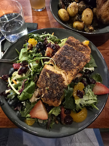 Read moreToday I decided to dine with this establishment for lunch. We arrived and was greeted by our host Taylor who had just started today. She gave us the opportunity to sit where we wanted. We were then greeted by our waiter Adam who was a gem. He luckily was also the Bartender at the time. The drinks he made were delicious and on point. I ordered the Salmon&Berry Salad which was hearty and enough to feed two. The salad was plentiful and delicious. It was a Blackened Salmon with a fresh bed of greens with blueberries, Strawberries, mandarin and candied pecans with honey lime vinaigrette. I also ordered the Pan Roasted chicken which I sampled while enjoying my salad and it was on point. It consisted of the the thigh and leg and breast with wings roasted to perfection, Brussel sprouts and roasted baby bakers (potatoes) I had ordered to eat later for dinner. My husband ordered the Veal Parmesan and the Jumbo Seared Scallops which he enjoyed tremendously. We also ordered drinks in which Adam prepared and they were awesome and refreshing. We asked about the Chef who prepared our meals and were told she's called Chef Smooth. The chef was on point with preparation and she definitely knows what's she's doing. If you want to enjoy an establishment with great ambience and decor this is the place to be. Can't wait for our next visit. I want to give more than 5 stars because the staff was inviting and such a great help with patience and making the consumer feel important, so thanks to you guys for that. You guys...