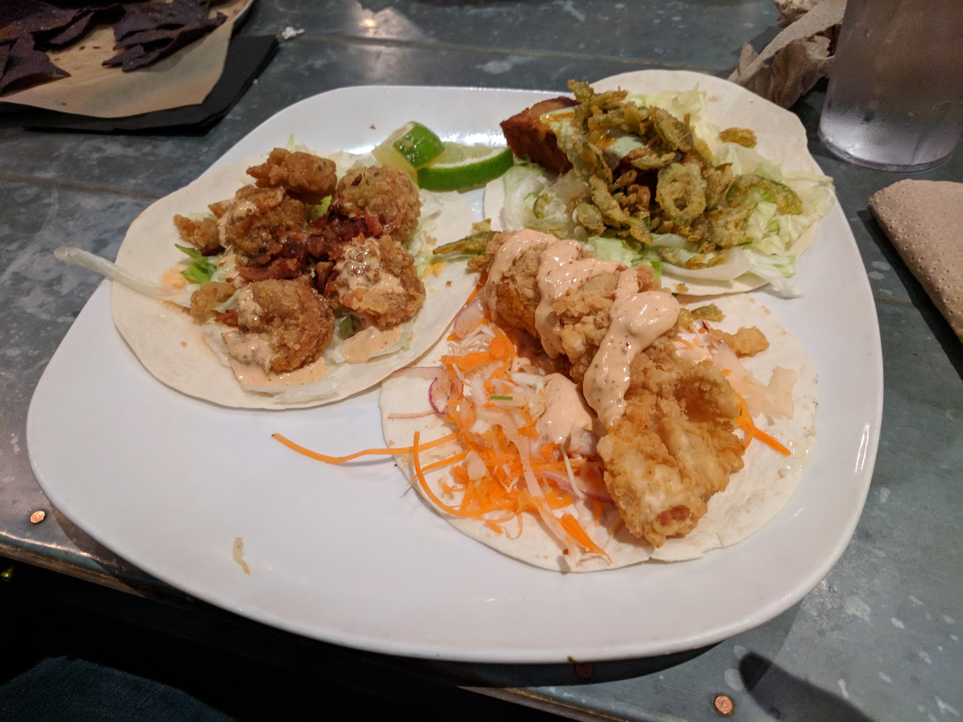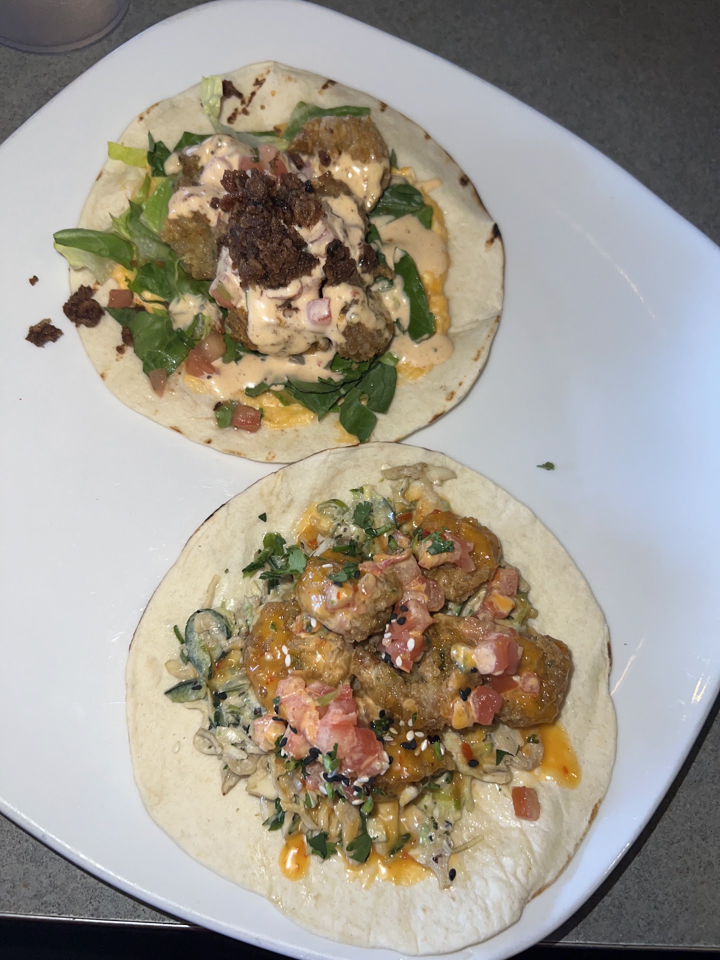 I also had the southern tide and it was also delicious. It is crispy shrimp with apple wood smoked bacon cut up, pimento cheese, shaved lettuce,chipotle ranch and pico de gallo. I went for shrimp tacos because I wanted a light entree since I wanted to try the brisket egg rolls. The egg rolls were amazing! It had Mac and cheese and peppers and I would love to eat the filling inside of a sandwich because it was so comforting as an appetizer.
