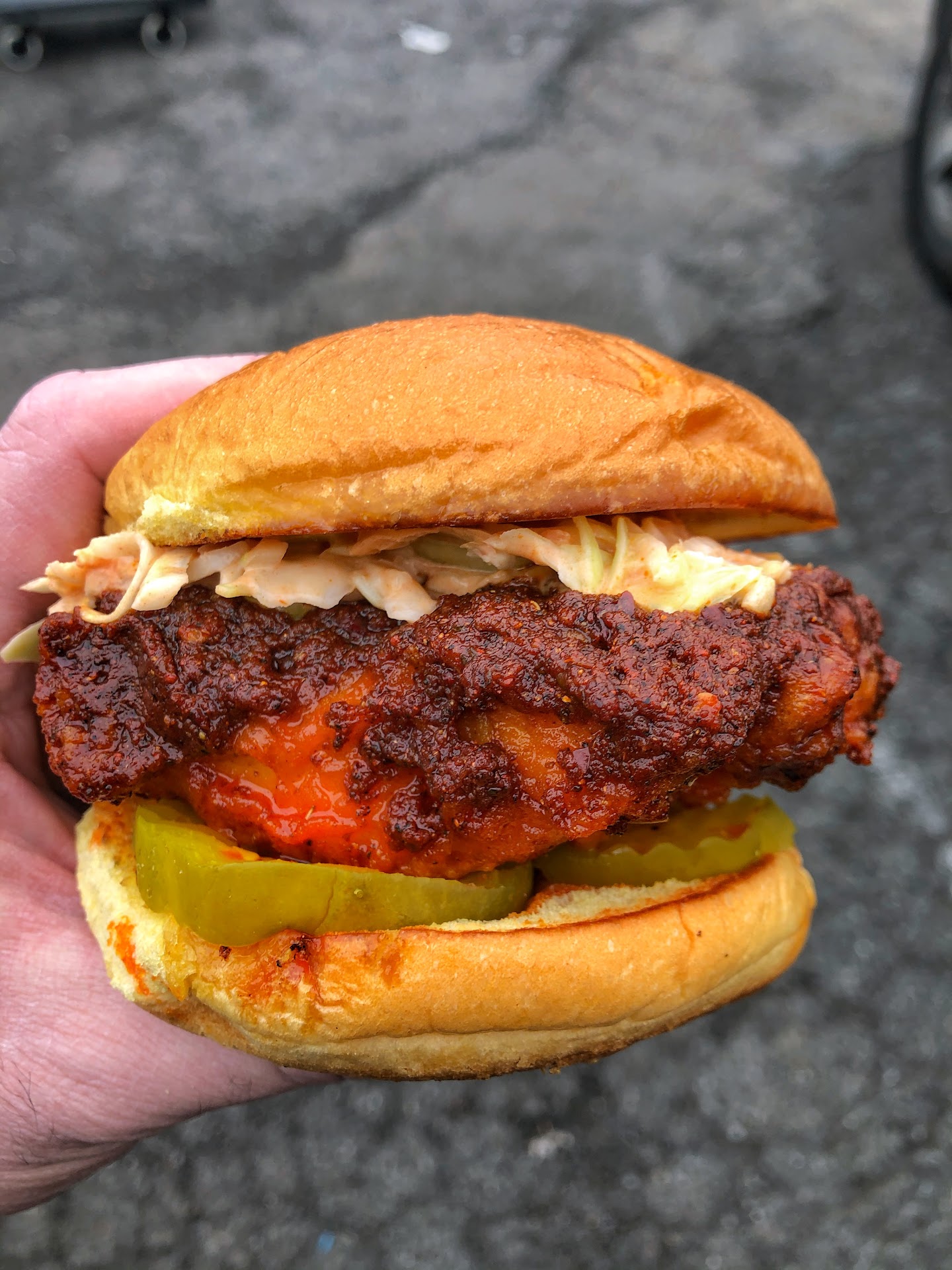 Crispy Chicken Breast smothered in their own Nashville spice blend, with pickles & spicy slaw on a buttered & toasted @potatorolls. No Antibiotics Ever!
