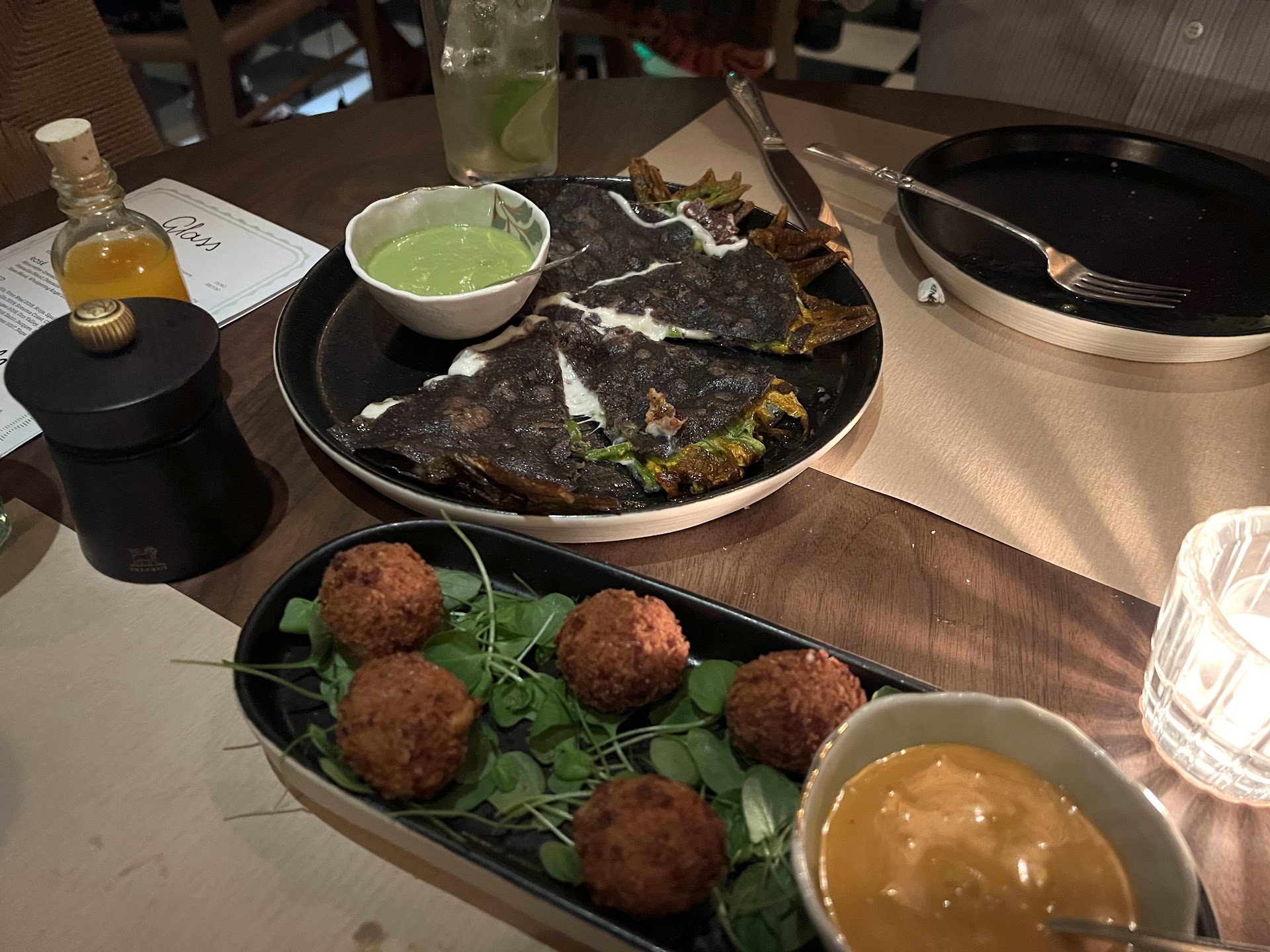 The squash blossom quesadilla arrived deep fried, with the same creamy green salsa as the chips, and the blossoms had lost any of the character they started with. It was cheesy and satisfying, but needed salt, which I added, at which point the whole thing tasted like buttery movie popcorn. The oil and the cheese made it surprisingly heavy, given how light the rest of the meal had been.