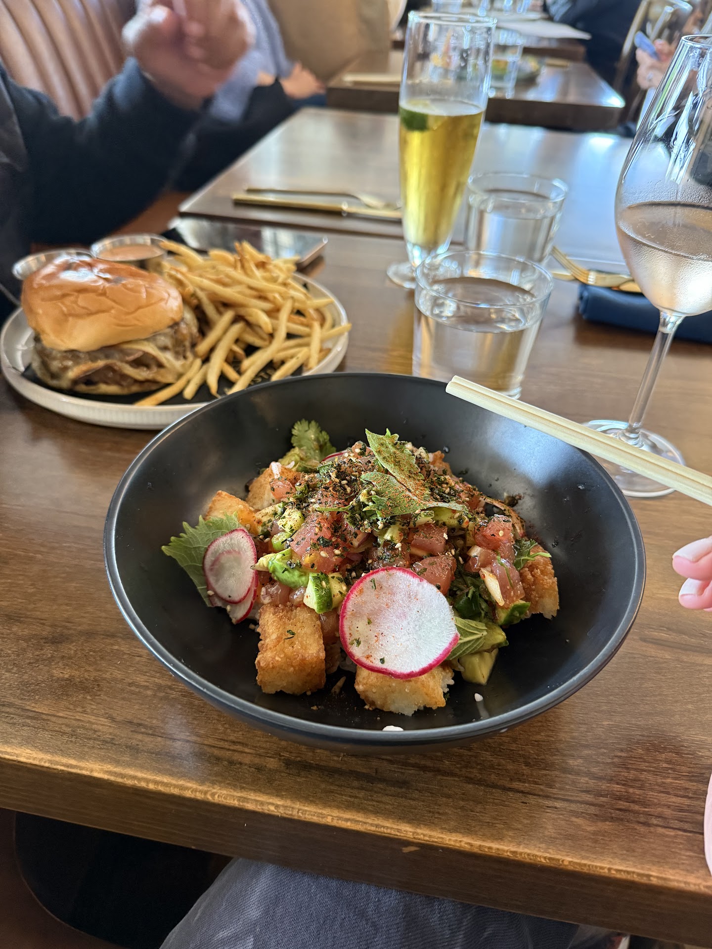 We decided to try a little bit of everything! We happily shared two French onion soups, which became a crowd favorite. Don't miss out on the cheese pull!! The Tiger Mom dumplings were delectable (Instagram favorite!), as were the crispy calamari. The shiso on the Ahi tuna burger made it light and fresh. My father loved the steak au poivre; Fusilli a la vodka was wonderful too. The staff was very attentive as we dined, our water glasses were never empty.