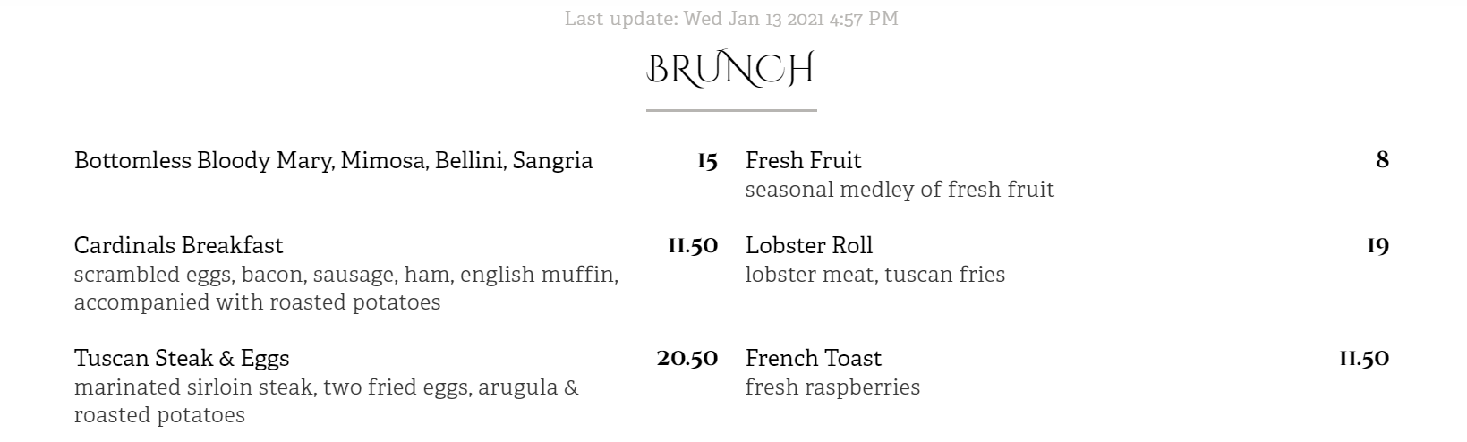 Appetizers for 4 took 25 minutes after ordering, and the entrees came (only after we asked 4 separate times, twice asking the head person) 53 minutes AFTER the appetizer plates were removed! 3 tables we know of arrived 10-15 minutes after us and ordered at east 15-20 minutes after we did and were served their entrees (after appetizers) well before our entrees arrived ... the arrived AFTER we gave the waiter our 2 credit cards to pay for our drinks and appetizer and told him and the head person we were leaving. Our cards were returned to us saying 'no charge' for the 4 drinks and appetizers; which I suppose was the only reason I gave a ONE STAR rating instead of a ZERO rating. Was NOT the waiters fault; but the kitchen clearly cannot handle a Saturday night crowd...and our 7PM reservation was seated in a room where half the tables were filled for the first hour we were there. I suspect the kitchen was told to leapfrog other orders ahead of ours likely for diners who are known there... if that was not the case then it is a kitchen that badly needs training on how to handle orders. Net/net: a waisted night; although we went 1/5 mile away to an Italian restaurant that was very good...and with fast service.