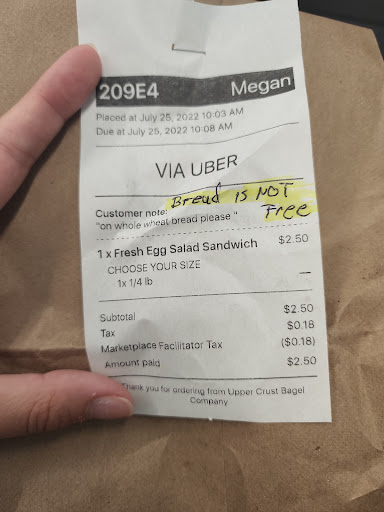 This used to be my favorite place to get bagels and egg salad sandwiches. I will no longer be a customer here. I usually order the same selection, "Fresh Egg Salad Sandwich," on UberEats when I cannot stop by. There is no option to choose which bread so I always write a note that I would like whole wheat. Today I received just a container of egg salad and a note that bread was not free. Not once in the past was I ever told that my "Fresh Egg Salad SANDWICH" would not come with bread. I called and asked why this time I did not receive a sandwich and was rudely told two things: that I should have put a note that I wanted bread (which I did) and they could not make me a sandwich for the price listed. I proceeded to tell whoever I spoke with that I always have ordered the same sandwich and there is no option to choose your bread only add ons for toppings such as cheese, lettuce, etc. They should not list the item as a "Fresh Egg Salad Sandwich" if you will not receive a sandwich. Very disappointed in the customer service, someone could of called me and let me know and I would have gladly paid whatever extra for the bread. Why should I be punished for...