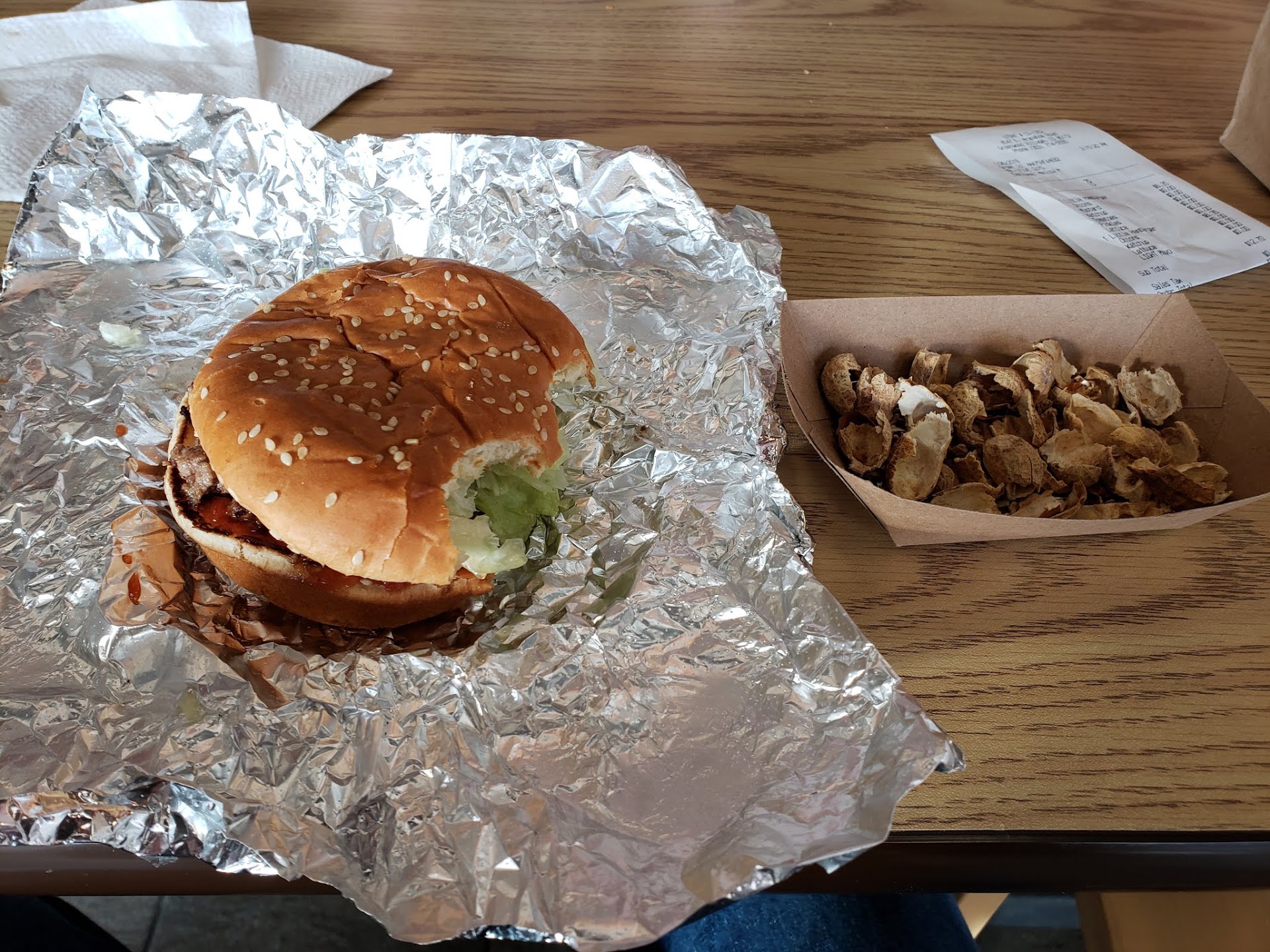 I would have like to have given more but honestly I don't think the burgers are worth the price. The best part is probably their hours as they're open later than most places nearby, and French fries. As someone who's not a very big fan of fries I don't necessarily go here for that. If you're a French fry lover go for it as you'll get the bang for your buck with it. The burgers on the other hand are SMALL even when ordering the larger size. You can honestly get a better flavored burger and larger one at smash burger.