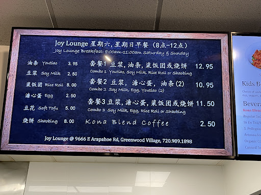 If you are around the area and are hungry for some Chinese traditional breakfast, head to Joy Lounge, which is located in the Chilgogi Restaurant on Arapahoe Road.