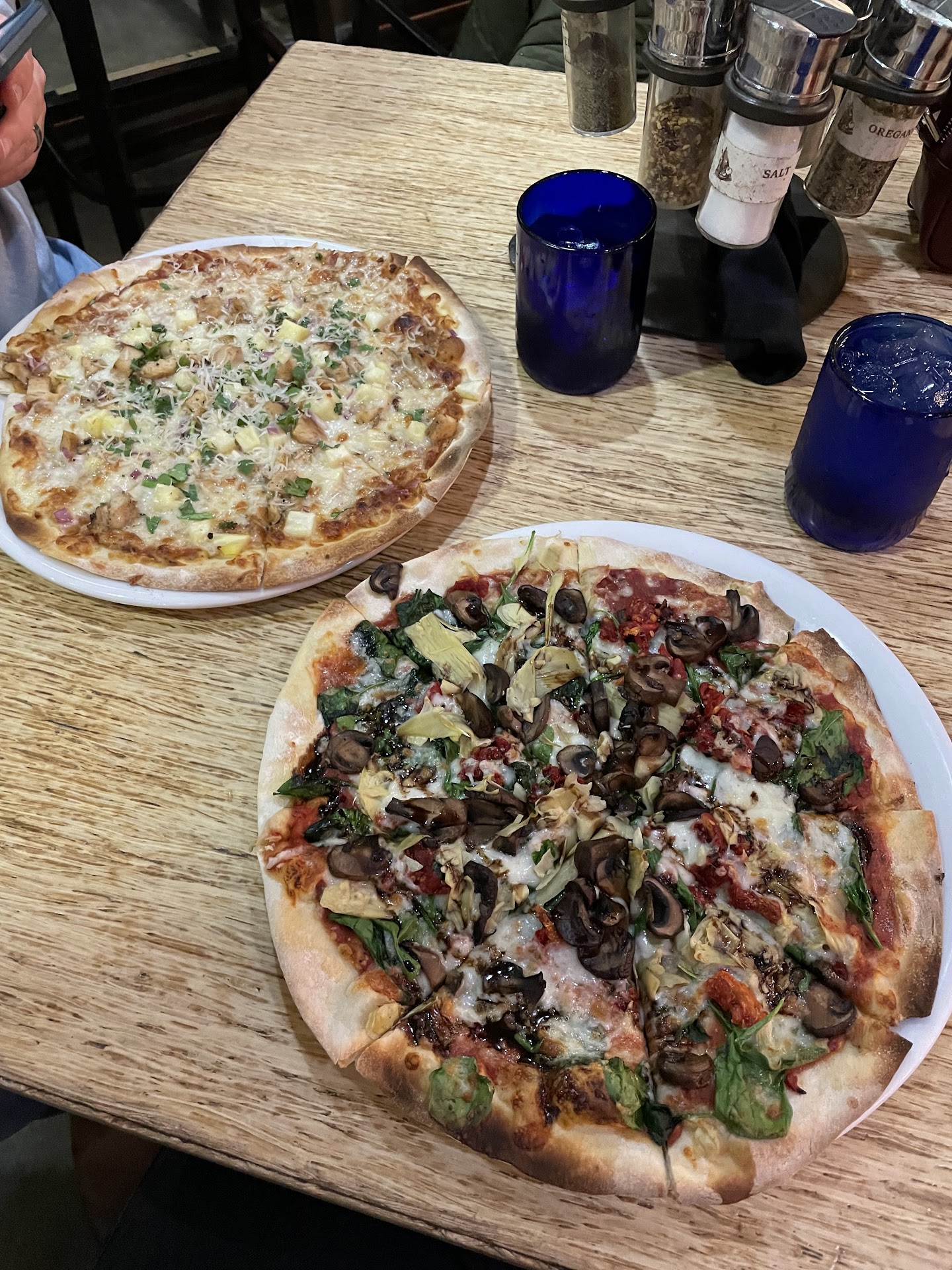 In this case, the answer is a resounding yes. Their pizza is super thin crust, and cooked quickly in a very hot oven. If you're looking for fat, doughy crust, this isn't the place. The crust has just a little crispy edge to add some textural contrast. There are so many ingredients to pick from and they will happily make whatever you want. Many of the "stock" pizzas are also very interesting combinations. I didn't have a salad, but my companions did, and gave it solid thumb's up. My vegan guests were both very pleased with their options - something hard to find at many restaurants. I had sausage and green peppers and toppings were fresh and tasty. They have a decent selection of beer and wine.