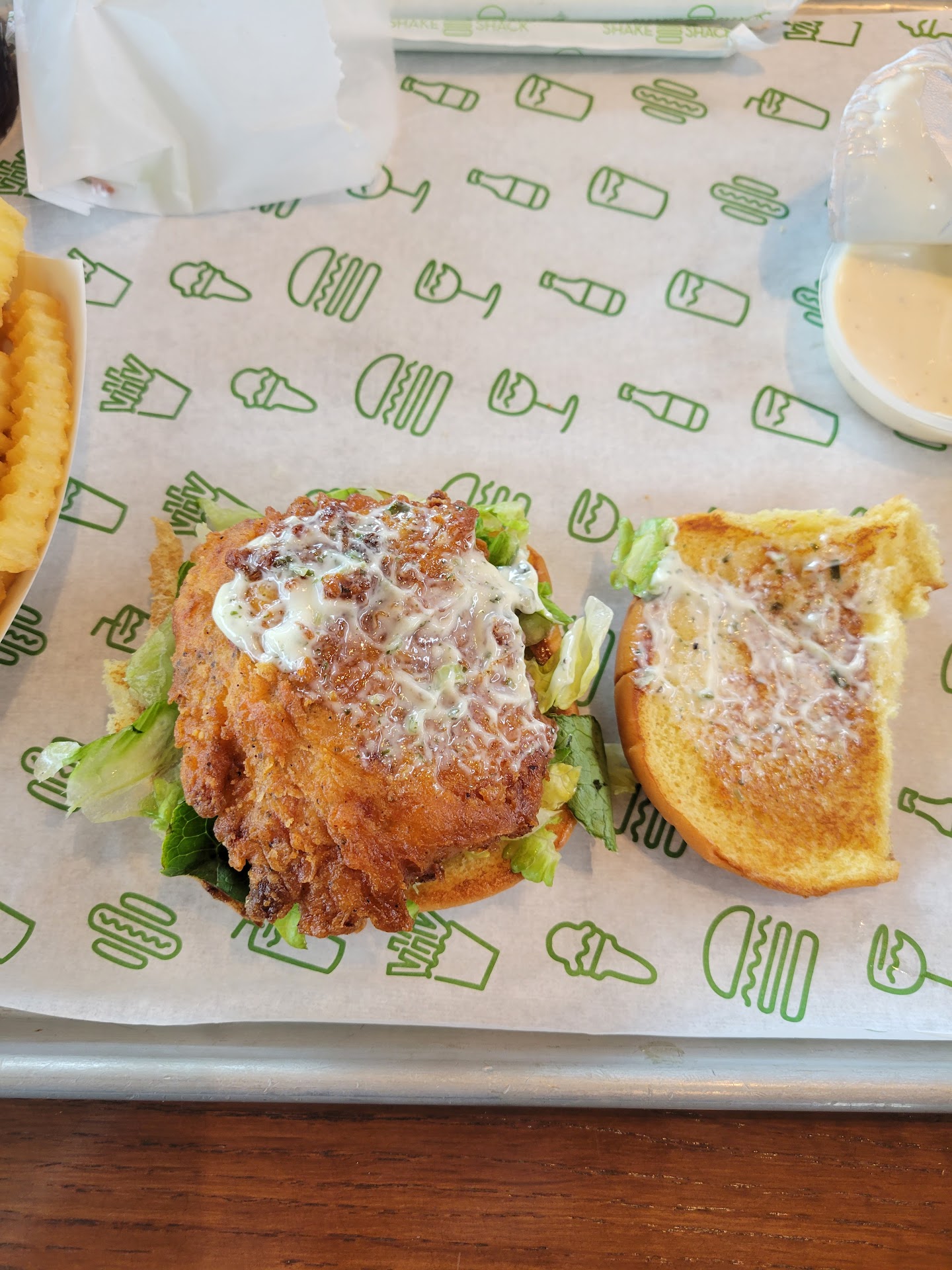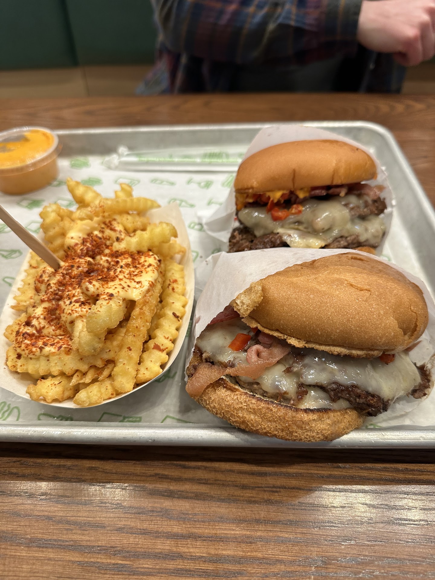Read more1st time at Shake Shack. Enjoyed the double green chili burger. It was definitely smaller than I thought it would be, especially considering the price. The fries you have to order separately. Don't get the cheese fries. It's literally nacho cheese from a can. They served ours chunky which meant the cheese wasn't even hot enough. Eww! I went up, after eating the burger and fries, and ordered a cup of the custard one scoop. First, I had to actually grab the cashier's attention because her back was to me. Then, after ordering I stood there and watched as one girl scooped the custard (you could see the bottom of the cup,that's how little was in there) and put it in a mini fridge. Now, there were people in front of me who had ordered, but was I really going to have to wait until they got their food to get my barely one scoop of custard?? You have to be kidding me. I had to approach the cashier and ask her if I had to wait for everyone else to get their food, only for her to say she was waiting for the cup."it's in the mini fridge... the girl put it in there 4 minutes ago." Doh!! Needless to say, I'm sorry James Corden, you may love this place, but for a restaurant at it's prices, shake Shack will not be getting my service again. Freddy's and Culver's is 100...