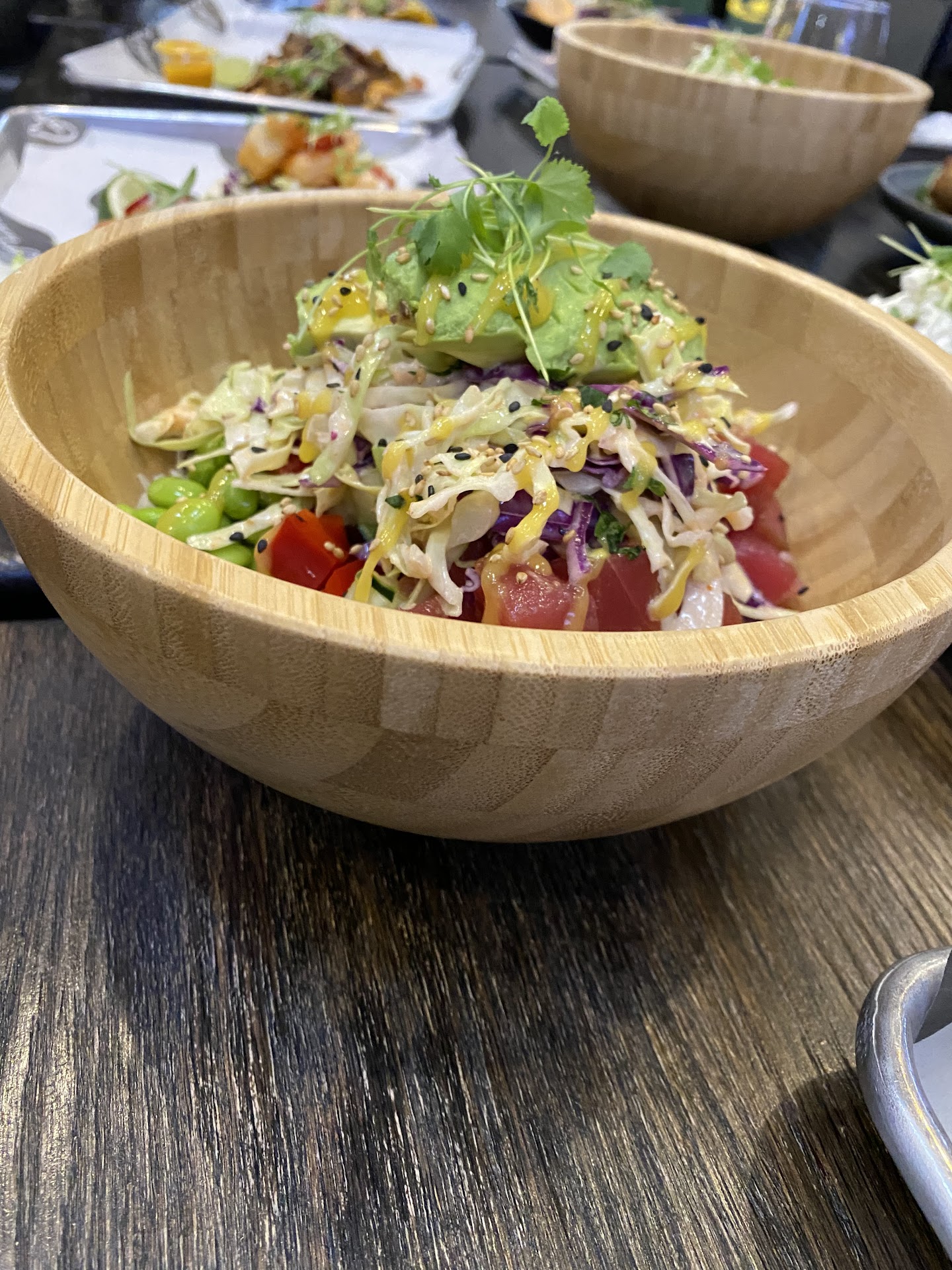 Tacomono is a Mexican/Asian fusion restaurant and the flavors are incredible. The salsa and the avocado with pico were delicious… the avocado with pico had thick pieces of avocado in it, which made it even better. We enjoyed those starters tremendously, and my 3 year old even really enjoyed the avocado with pico. Not spicy at all.