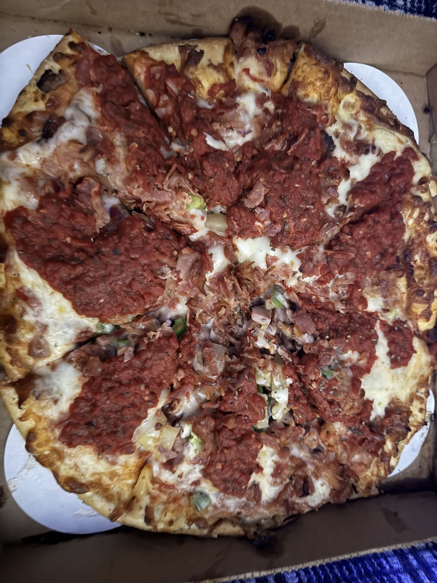 Finally got around to trying this local pizza place, after seeing the crowds there every weekend in the summer. The interior is large, if a bit bare bones (concrete floor, wood tables, nothing fancy) but they also have a ton of art on the walls (for sale) by what I believe are probably local artists. So that was interesting. One smallish tv in the "bar" area (they serve wine and beer). We came when it was snowing out so we got seated right away since the place was pretty much empty. We started with breadsticks (6) which came with a choice of 2 dipping sauces. We got nacho cheese (typical, from the jar kind of stuff) and a creamy garlic Parmesan concoction that, while it had sort of a strange texture to it, was really good when you dipped the hot bread in to it! Very generous portion of dipping sauce, and the sticks were good, though they were pretty typical for ones you might find in the bakery section of a grocery store. Without the sauce they were nothing spectacular (fresh and warm, with the sauce though....yum!). At the waiters suggestion, we tried a half and half pizza, half of two of their specialty pies. They seemed to have a ton of choices for the make your own pizza stuff. Lots of different cheese choices, sauce selection was impressive, as were the different toppings to choose from. I was sad they didn't have a "burger sauce" option (which is kind of like thousand island, or McD's secret sauce), which I love as a hamburger pizza. We settled on half a Maui pie (pineapple, bacon, onions, green peppers) and half of a Cheese Louise (like 5 different types of cheese, plus onion and bacon). Both were quite tasty and toppings are generously applied! Fantastic! Lots of cheese on both, lots of bacon on both. I'm not sure if it is supposed to be a thin crust pizza, or they just make their crust very thin, but that is what we are calling it.....thin crust pizza. While I enjoy thin crust on an appetizer type pizza, I am not really a fan of it for a dinner choice. That's really why I didn't give it 5 stars. To be honest, even with all the toppings and cheese it was a bit.....disappointing, flavor wise. Other than the crust, I can't pinpoint why we found it just "good" not great. We're glad we finally tried it, and I do love the different choices in cheese and topping selections, but I can't see making a trip there again, not when there are better options (Brozzini's comes to mind) for pizza with a thinner crust. It kind of reminded me of the pizzas my kids used to make at home on "make your own pizza" nights. Good, but not spectacular. Service was very good, quick soda refills (always a plus lol), waiter was helpful when trying to decide what to try, and prices...