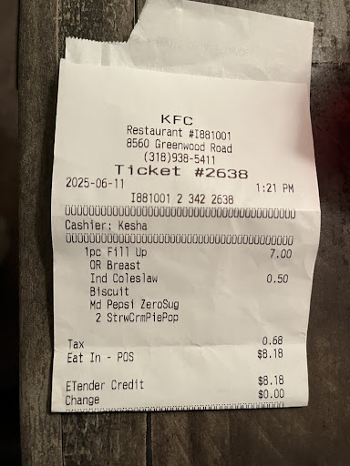 Ā Ā Ā Read moreWouldnāt recommend at all!! My food looked like it been sitting there for hours! Then got my box that was lighter then my drink! The chicken was so small my 6 year old didnāt even get full! Not happy at all about the customer service the dining area was nasty drinks spilled all over the floor!Was just really upset about the portions that was given to us! Husband felt it was intentional being we was trying to read the menu taken away from her phone time! Update: just now I was very pleased with the manager reaching out to me to apologize for how we was treated and the food! He also was interested in hearing what our thoughts were to make it a better place! We need more managerās like this! He also will be replacing our meal on them!Very nice respectful guy! I could deal with that! Lord bless him! KFC...