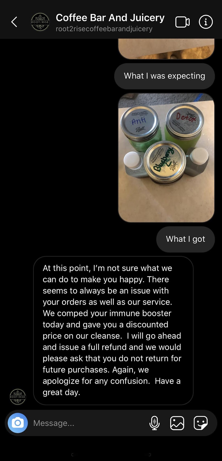 Extremely disappointed with the services. I’ve been going here for over a year, & recently I started noticing little things that they are ripping you off on. Employees not having mask on or requiring their guest to, really changed my mind on saying something. DONT BUY THEIR JUICE CLEANSE!!!! They make it from the same juicer they make the “walk-in” juices with, yet the actual cleanse is priced higher and doesn’t add up! & If they ARE NOT FILLING YOUR GLASS TO THE RIM, IT IS NOT THE PURCHASED AMOUNT OF OUNCES! I’m sorry, but I 100% want to get what I pay for and that missing 2-3oz adds up! When I was trying to make sense of it all, I brought it up to the owner, hoping she would have an answer or at least pretend like she didn’t know and fix it forevermore. Instead, she had no reason or answer for why the drinks are priced higher for the cleanse. She was instantly defensive and then proceeded to BAN me from ever going in again. The drink they “comped” (you will see in the pictures below) was my free drink from their loyalty program. Meaning I have bought 10drinks and now get the 11th free. After sending her what SHE ADVERTISED on social media, she still couldn’t give me an answer why I didn’t get what they advertised their cleanse as!! Then she proceeded to, not only, ban & block me from Instagram, but she blocked MY CATS INSTAGRAM TOO! Being one of the only places for fresh juice in Greenwood, I was extremely upset but I honestly already felt ripped off before this happened, and am better off without their negative vibes! They don’t care about their customers they just want your money, even if that means stealing it from you and they will not try to make you feel better about their brand at all. Just walk away...
