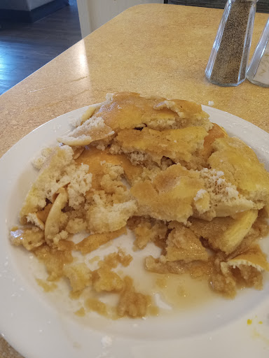 My first visit here was like a week ago. I wanted a traditional breakfast so I ordered 2 pancakes with eggs and grits. I'm not sure what was going on with the pancakes from the moment I touched the top one to lift it to put butter on the second pancake it fell completely apart every attempt I made. I finally got butter on both pancakes and poured syrup over to see if they tasted okay or not. The pancakes did taste good what does syrup on but the whole falling apart turn me off from pancakes, maybe it is the recipe? I had a very friendly & young waitress so I stopped her and told her about the pancakes, she said ppl come to eat other stuff mainly & if I wanted something else and I said yes please some french toast. (Already ate my egg and grits) The French toast was good if I was to never know about sweet brioche bread. A lot of restaurants are using brioche bread for their French toast because it is sweeter, & taste better but this French toast was made from Texas toast as I guessed & confirmed with the waitress. I checked out my bill up front at the counter and I think it was the manager and she was very nice however when I mentioned my pancakes falling apart she was just kind of baffled... I took pictures, this is not me cutting the pancakes up...the pancakes taste good (I took a couple bites) despite falling apart, but I've never had pancakes fall apart like that at any restaurant Ive visited in my life. I would suggest either a better recipe for the pancakes or...