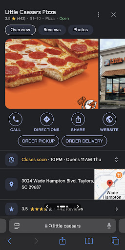 Ā Ā Ā Read moreI don't ordinarily do this, but--DO NOT patronize the Little Caesar's of Greer. We and a whole line of cars were left waiting in the drive thru for over twenty minutes tonight without even being acknowledged, much less ordering. I went inside and stood in line, and asked what the problem was. "It's just moving slowly." "But....none of us have even been acknowledged, or allowed to place an order." Staff member: shrug "Okay...I need this and this, and some crazy bread." "You're looking at twenty five minutes." "What about for my crazy bread?" "Shrug We don't have any." "You know what... I'm going across the street." "Shrug Okay!" This was with a CROWD of people working in the kitchen and counter area.