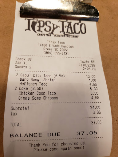 Read moreTwo stars for the best margaritas I’ve ever had and good service, but after tonight we likely won’t be back. I ordered 3 tacos. One came out saturated in oil and water. It was the Don Mignon taco. Unfortunately it saturated everything on my plate. I called the waiter over and showed him and he said it was unacceptable and they would remake it and not charge me for that taco. By the time it came out again, my husband had finished his 3 tacos. The waiter told me it took so long because the first time they remade it, it came out the exact same way so he had to have them remake it again. We finish eating and get the bill and we were charged for the taco. In addition, they would not let us use all our coupons even though they had no terms and conditions or expiration dates. The coupon just said “free taco,” no more and no less. The manager couldn’t even be bothered enough to come out and talk to us, so the AGM said we could use some of them but not all. She tried explaining that the new coupons DO say you can only use one, but that should have been irrelevant for these since they did NOT say that. I do understand that rule and why that would be printed on a coupon but since it wasn’t printed, it shouldn’t have been an issue and should have been chalked up to their mistake for not listing it on the coupon. Every time we come to Tipsy Taco there’s some sort of issue either with the food or the service so tonight was the final straw, at least for the foreseeable future. Having owned a food service establishment for over 5 years, I am very sympathetic to folks in the restaurant industry and do not believe the customer is always right, but this should have been a non-issue, especially considering that the AGM already knew we had to send food back.