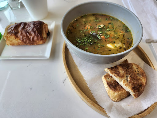 I ordered the chicken soup and it was THE BEST I have had in a long time! Tarragon, bay leaf, mirepoix, and handmade chicken stock are the backbone of this scrumptious bowl! May I bring my own gallon-size mason jar next time "to go", sil vous plait?!