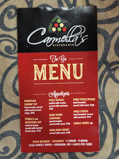 Read moreWent yesterday for the pizza, it was a great disappointment with hardly any toppings . I had them put 3 things on my hubbyâs side that I do not eat on a combo pizza, otherwise it would have had only about 12 pieces of pepperoni, certainly not enough for an $18 pizza that they were charging me $21 for, so check you receipts closely, it was blamed on the cash register lol. I also got an Eggplant parmigiana sandwich and Italian grinder to go.... also a big disappointment, as the eggplant was cut lengthwise and was tough, bitter and stringy!! The Italian had been heated in the oven, not what I had remembered from previous purchases and apparently the cup of dressing leaked as it was greasy as all get out, needless to say the meat was transferred to another roll. Service was just PK as we were given a minute to look at the menu and 10 minutes later my hubby had to go in search of the waitress. Needless to say my LAST waste of money spent at Carmella âs on bagged frozen meatballs, as I was told previously by someone who...