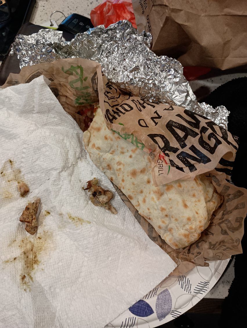 It was full of wet slimy lettuce, the chicken was mashed up, dry and stunk 🤢 Beans and rice had with no cojita on top. The Tortilla was dripping moments after I got it, they refused to give me a refund. I wasn't being rude, I just said honestly dude... Look at it. And her response was "what" and I can't give you a refund because nothings wrong.