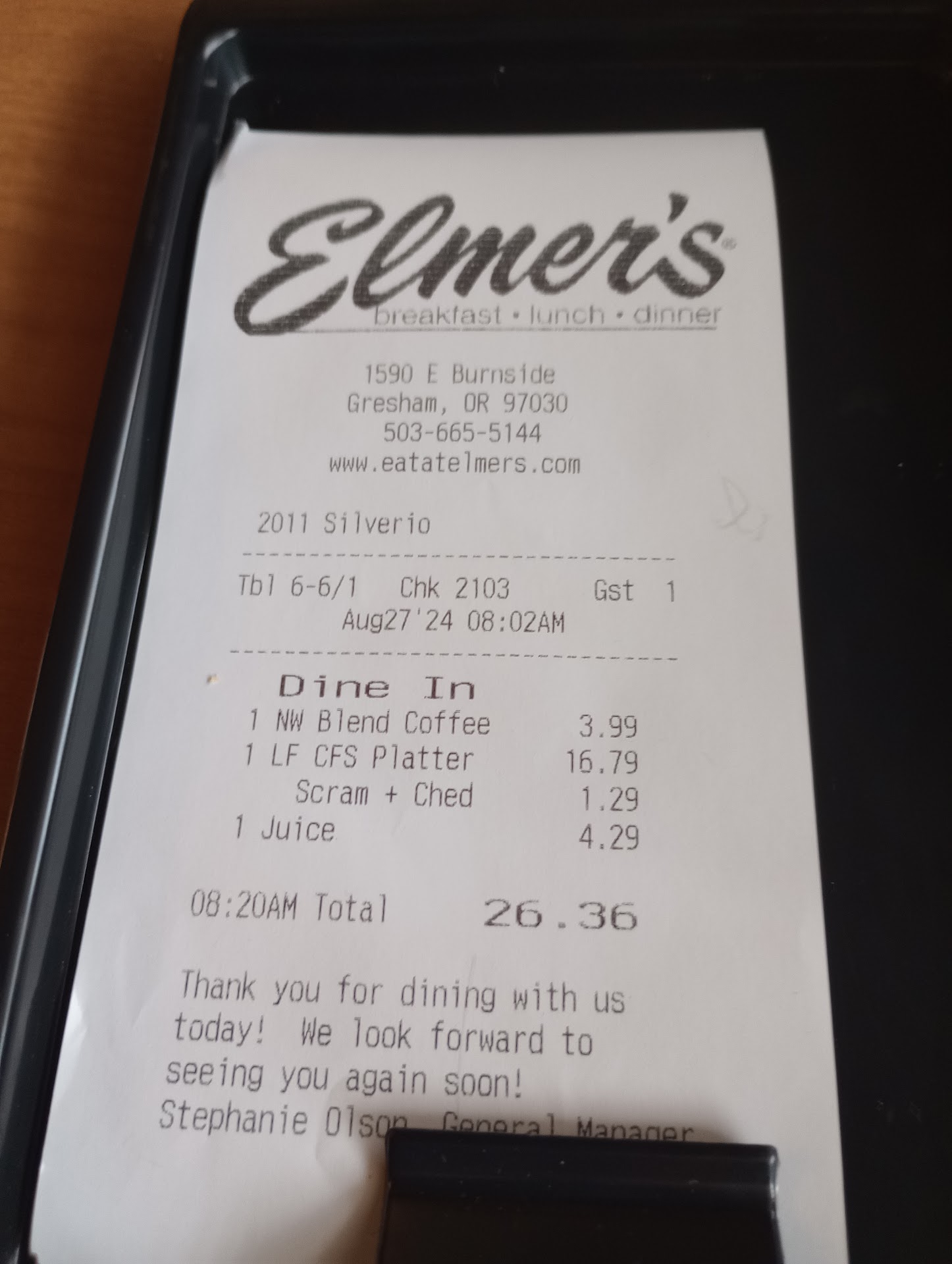 4/17/23 I love coming to Elmer's the one at mall 205 and the one in Gresham have the best friendliest waitresses ever... the cooks are exceptionally good. I wish the cooks would wear a hair net because some of these guys have really long not that clean hair. I'm always happy with the food and I'm always happy with the service. I wish I could figure out how to post a picture here but I can't.