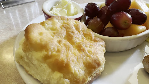 The omelet was amaaazing! It contained ham, bacon, onion, pepper and swiss cheese, but get this - it was stuffed with the amount of meat, etc that YOU would put in it if you'd made it at home! The hashbrowns were crispy as requested and the biscuit was soft, warm and fluffy.