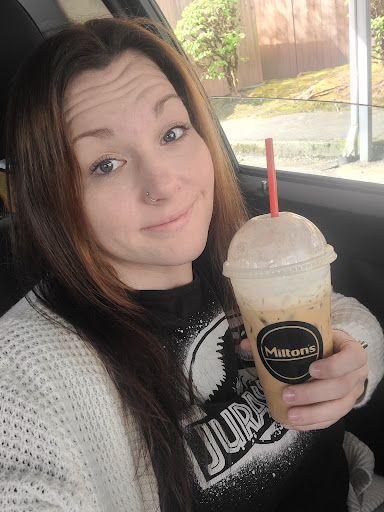 Iāve been stopping at the burnside Miltonās for a little over a year now. The girls are really sweet and fast, which is nice because I tend to run late. This morning I got a sugar free strawberry/raspberry Red Bull. Itās good amount of flavor with out being too much. I do normally get an actual hot coffee drink and they are always good. I also got a cheddar bagel toasted which is good. Then I always grab a piece of their coffee cake. Not sure where they get it, but itās really good! Good little...