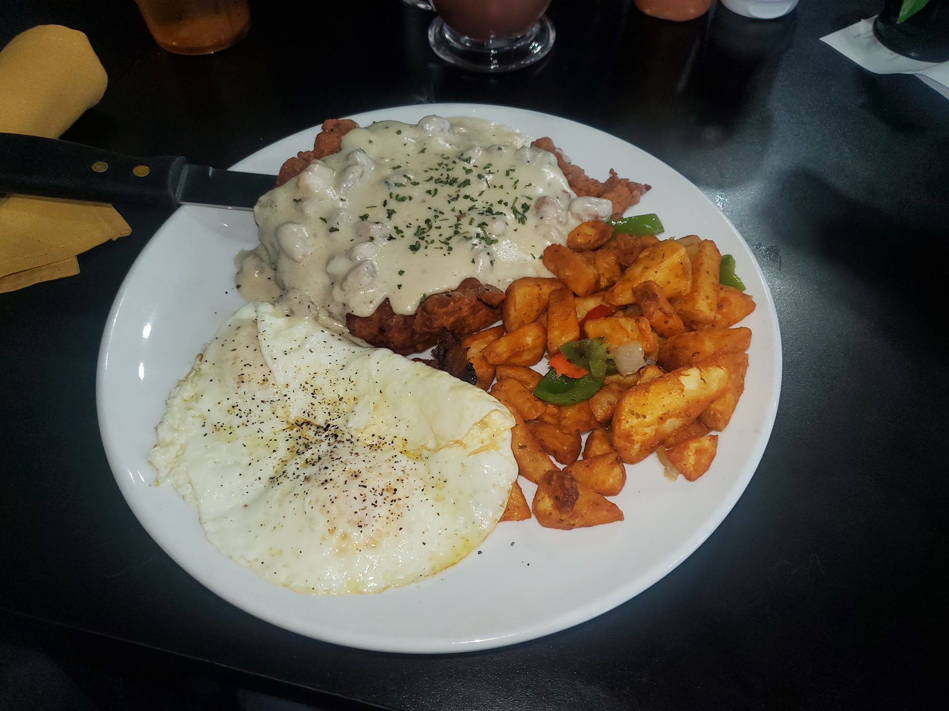 Read moreI finally tried this place and was amazed. Every time I drive by the parking lot is full and today I found out why. You order breakfast first and then seat yourself but that didn't bother me at all, be prepared to know what you want especially if you're in a group. I've been hankering for Chicken fried steak and was pleasantly surprised. First off the staff was super polite and beyond friendly, they made me feel like a regular. They wright your name on a cute little chalk board in a mini planter-neat idea! I also ordored hot chocolate and it was awesome. My food arrived quickly and looked great. Eggs (over medium) were cooked perfectly as well as the home fries, neither were over or under cooked. And the Chicken fried steak was phenomenal. Again, perfectly cooked and you could easily tell it was scratch made as well as the sausage gravy. Writing my name had two uses, it told staff not only where I was, but who I was, greatly adding to the experience, and again, making me feel like a valued regular. This is my new go to breakfast joint and I can't wait taste...