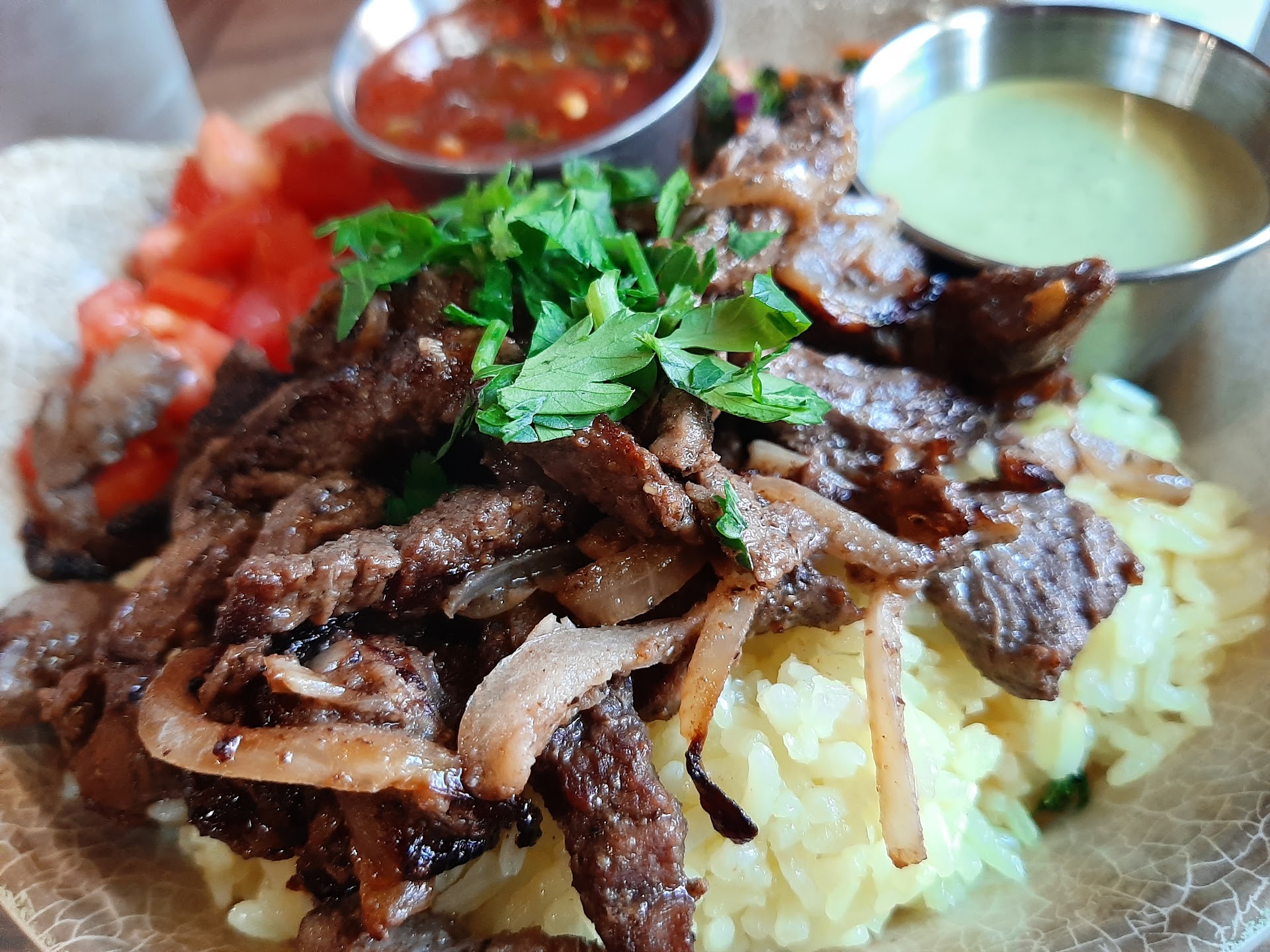 Every. Dish. On. The. Menu. Was. De-licious. Fusion of flavors felt like a feast for my taste buds, and I am pretty sure I closed my eyes, saod Mhmmmmmm, and slowly chewed on on my beef shawarma dish. Tender meat, perfect blend of spices and herbs, and rice that is perfectly steamed and complementing.